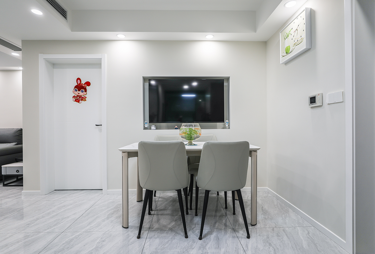 餐廳空間比較寬敞,淺灰色地磚很干凈,色彩和造型上都簡潔大氣。