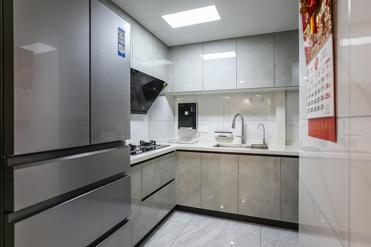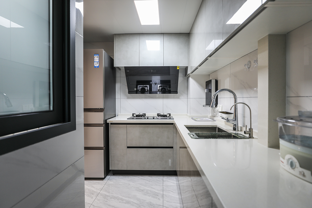 廚房是老爺子最喜歡的區域了,臺面采用巖板,干凈,大氣,吊頂是大板蜂窩板,L的料理臺也方便制作各種美食。