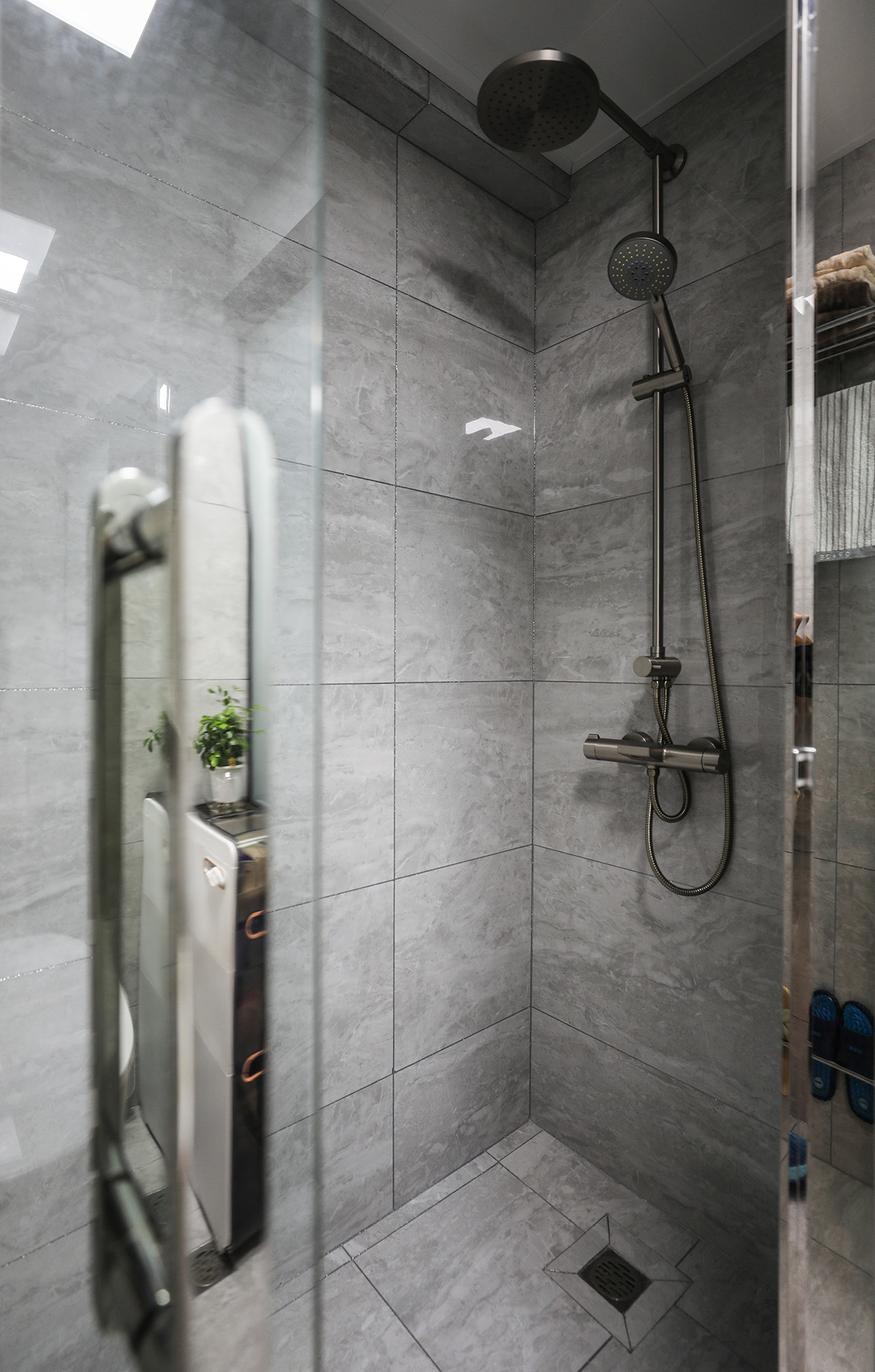 懸空浴室柜搭配墻鏡,玻璃推拉門讓空間做到干濕分區。