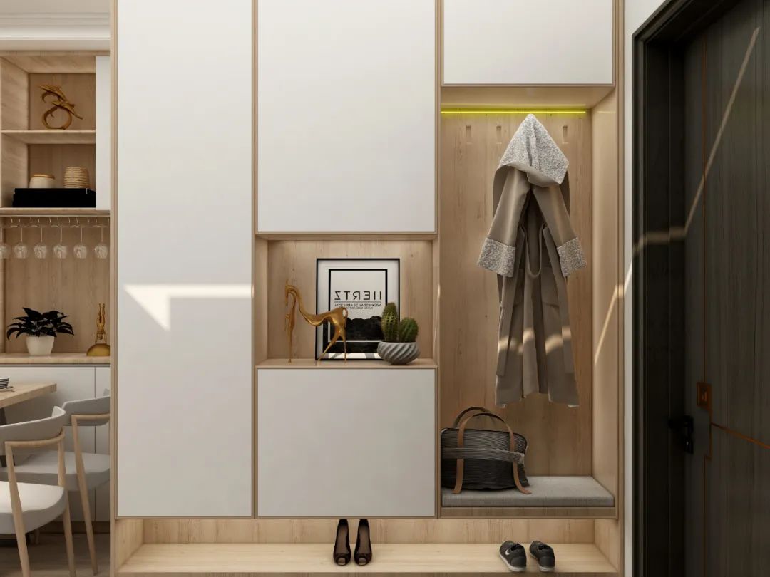 一體式換鞋凳既優化了換鞋時的體驗,又能額外增加儲物區,“多功能”設計解決了入戶區的“亂”,更為干凈整潔。