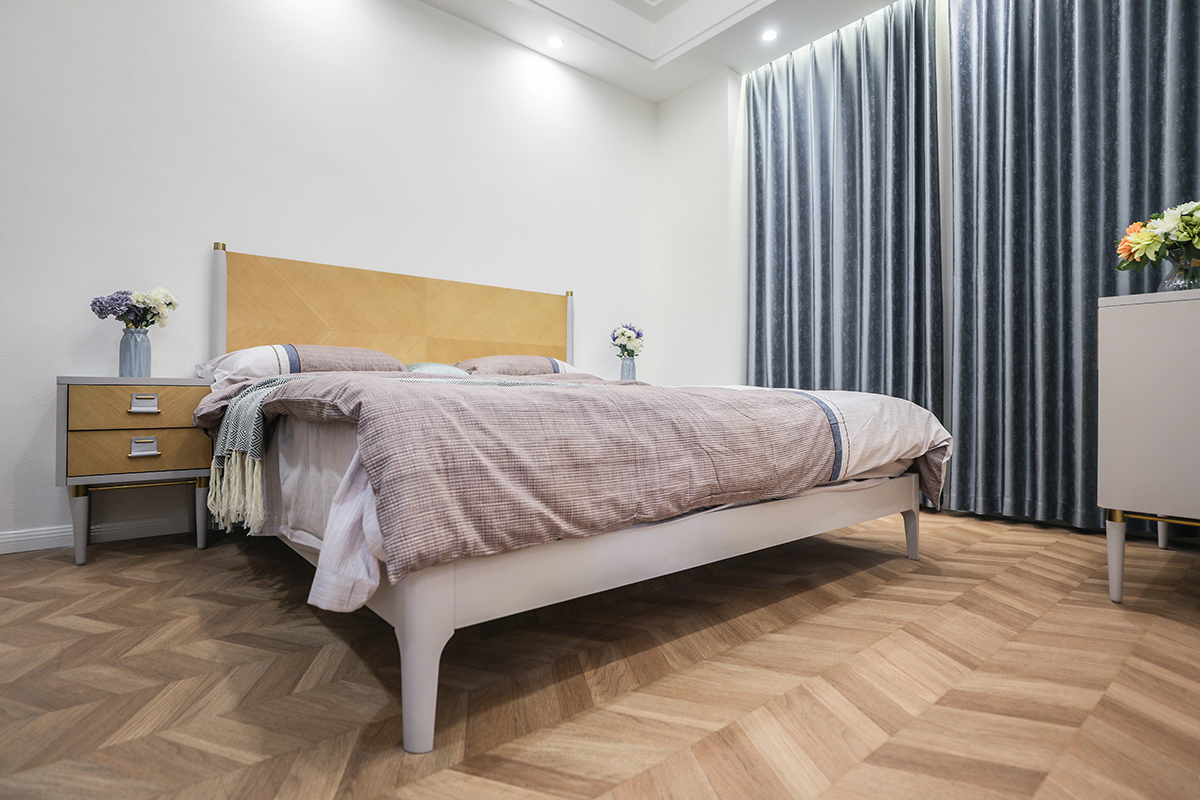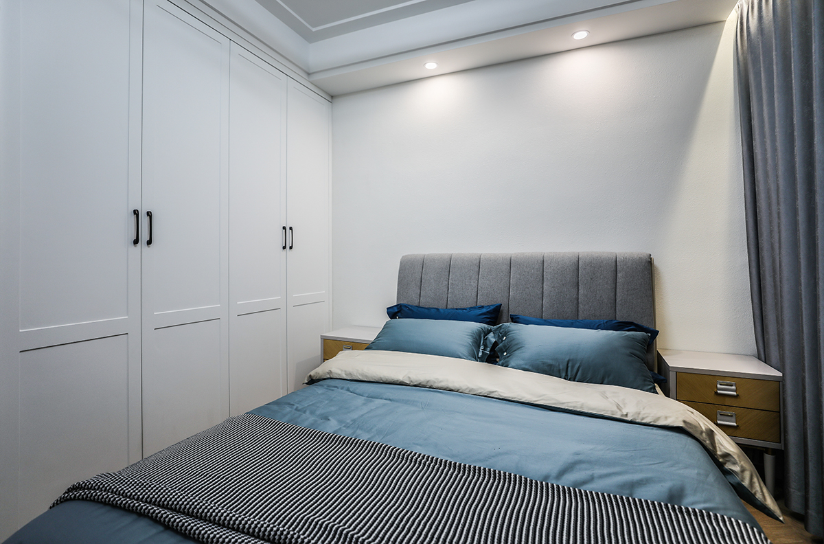 次臥簡(jiǎn)潔的造型墻面配有木質(zhì)的地板,空間變得溫暖起來(lái),帶有明亮而質(zhì)感的空間氛圍。