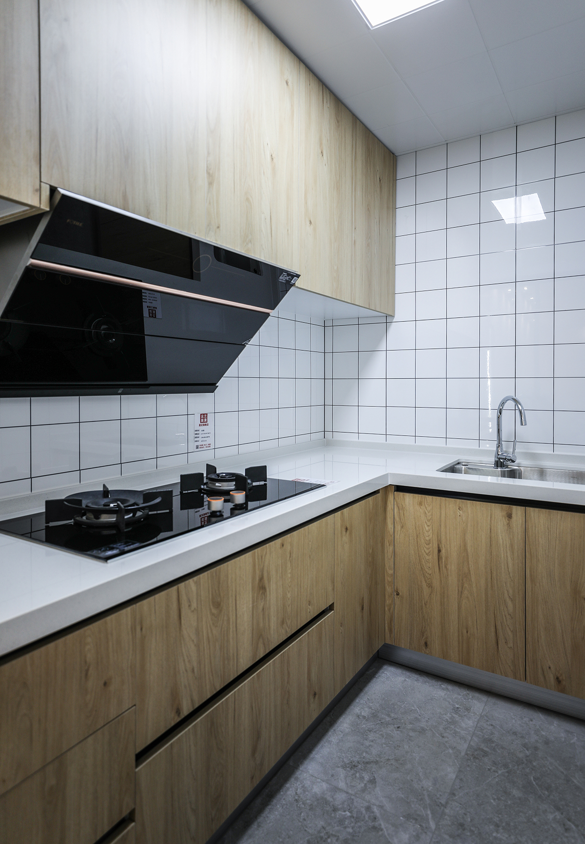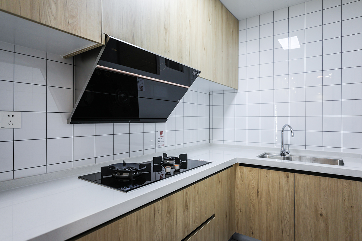 廚房原木色的門板搭配白色的臺(tái)面,地磚淺咖色石紋,干凈清爽。