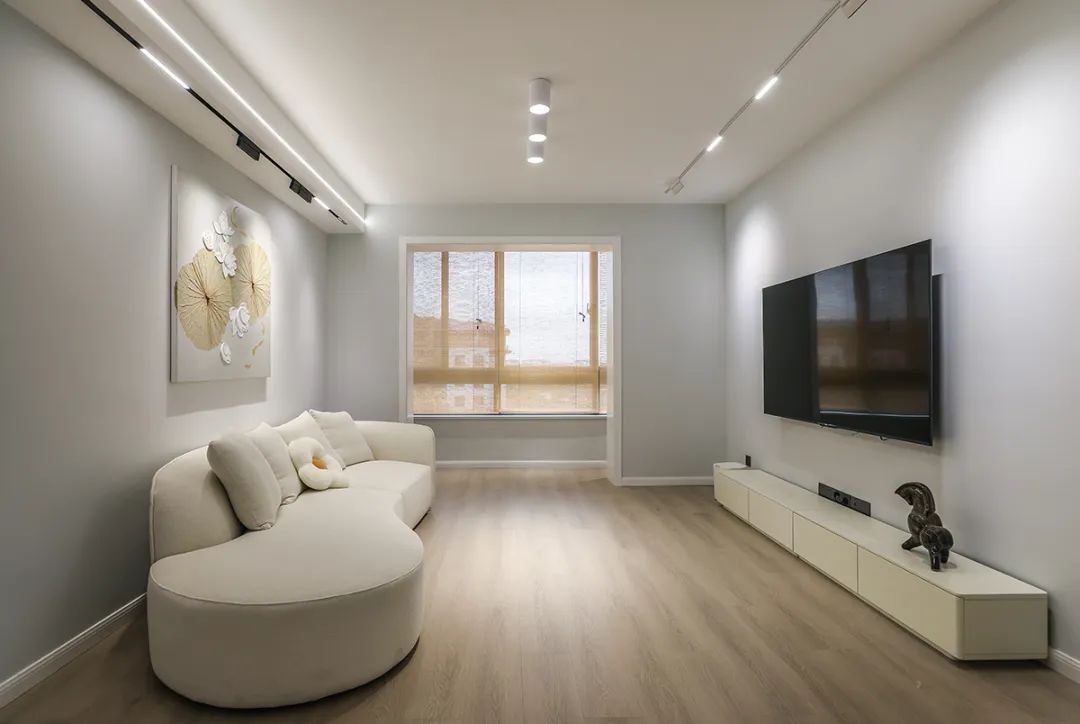 3、白色移門隱藏電視,兩邊是木質飾面板,顯得清爽利落。