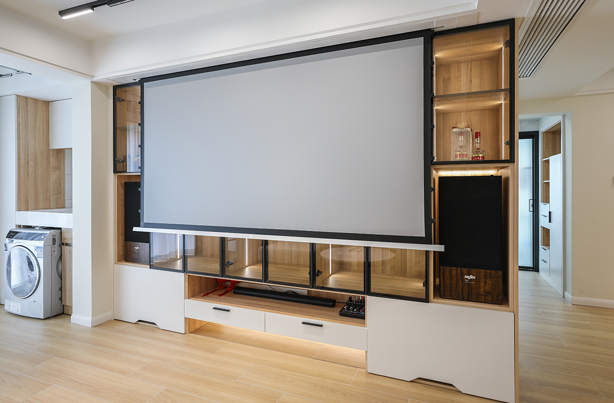電視背面采用組合玻璃柜加上暗藏式投影來設計,既增加了儲物功能,也可以休閑娛樂,讓整個空間活躍起來。