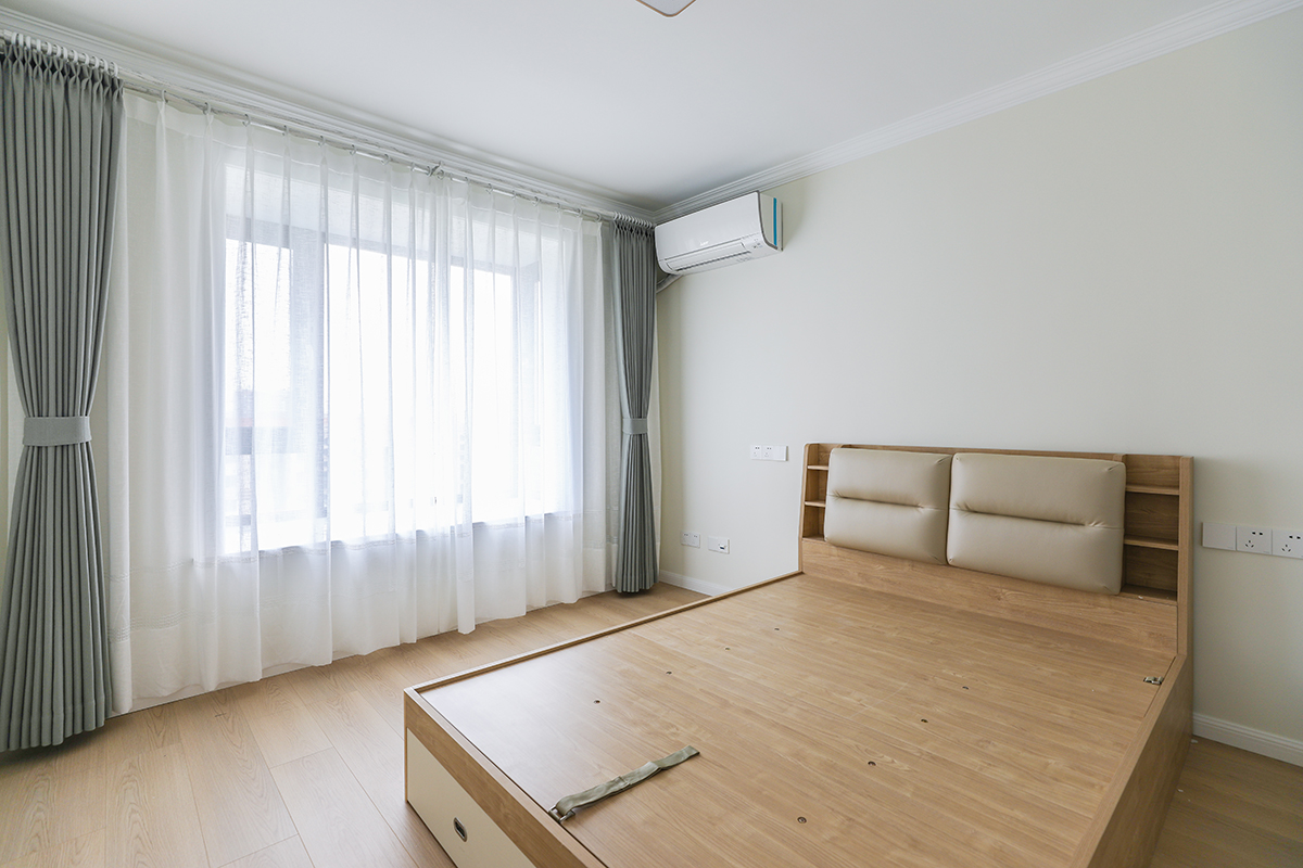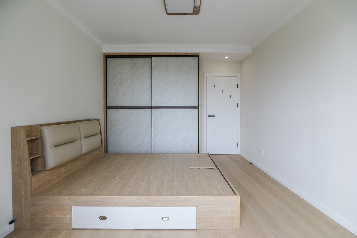 主臥簡單大方,沒有多余的色彩,原木色的家具加上原木色的地板,墻面采用網紅色可可蛋奶,清新干凈!