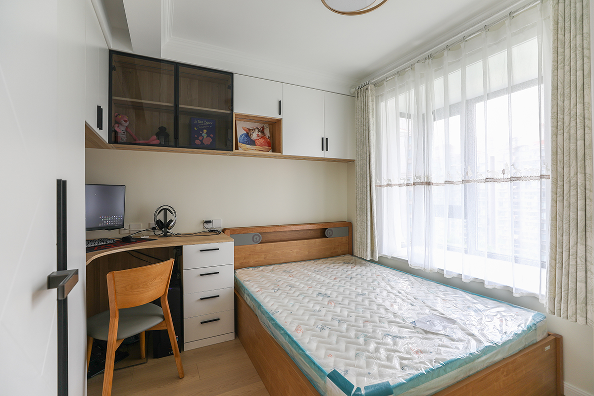 次臥是以后寶寶的房間,衣柜和書柜連成一體,充分利用空間。