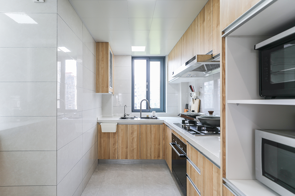 廚房利用了北陽臺延伸,增加使用空間,一樣采用了原木色系為主打色。和整體風格相呼應!