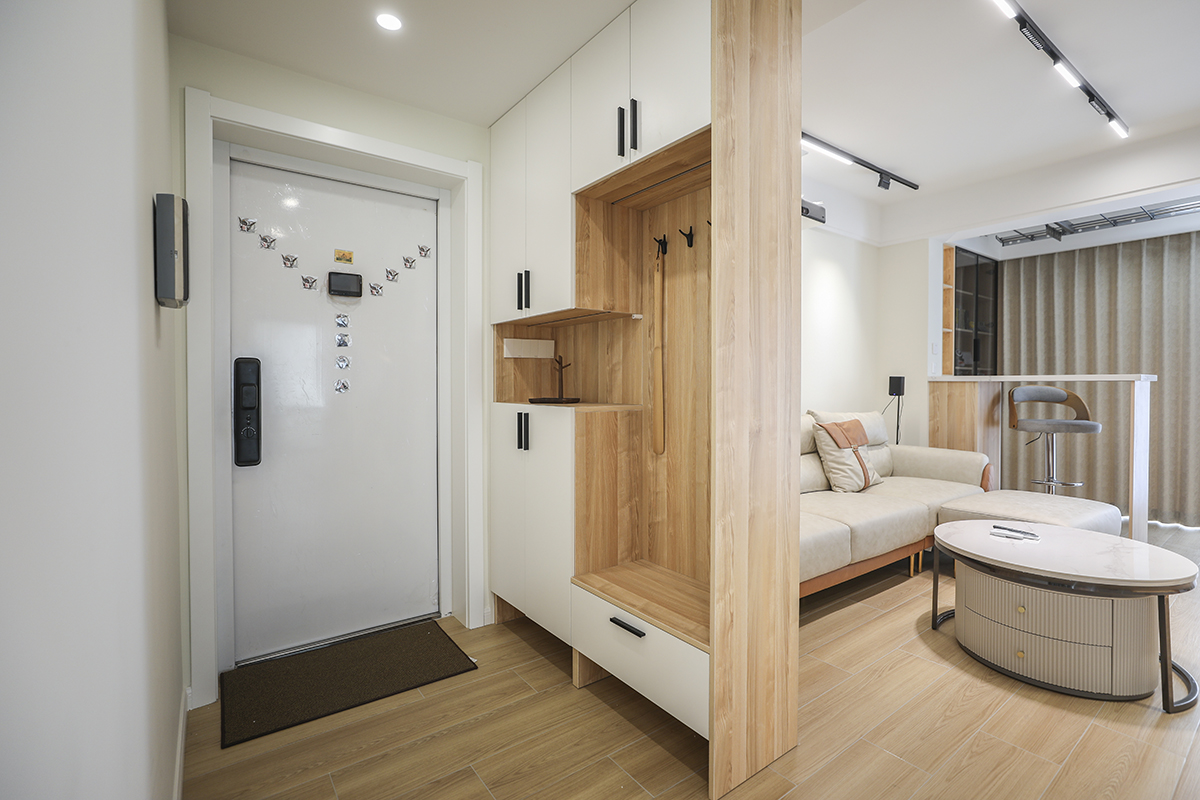 進門玄關柜的設計也是一大亮點,一半為換鞋凳+掛衣區+上方吊柜,為一半為儲鞋區,中間和下方留空設計,并有燈帶點亮空間。色調上和整體風格統一和諧。