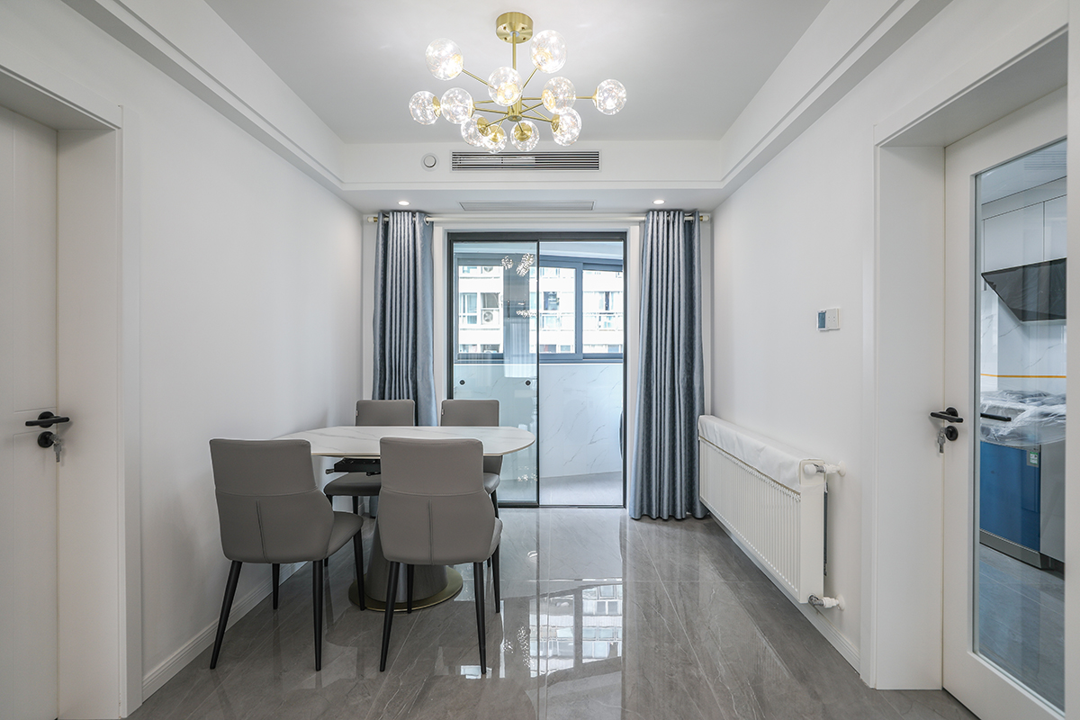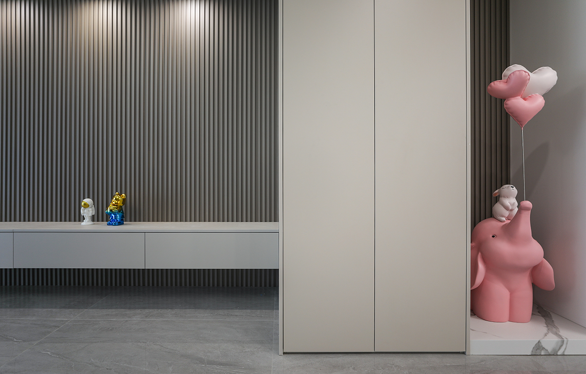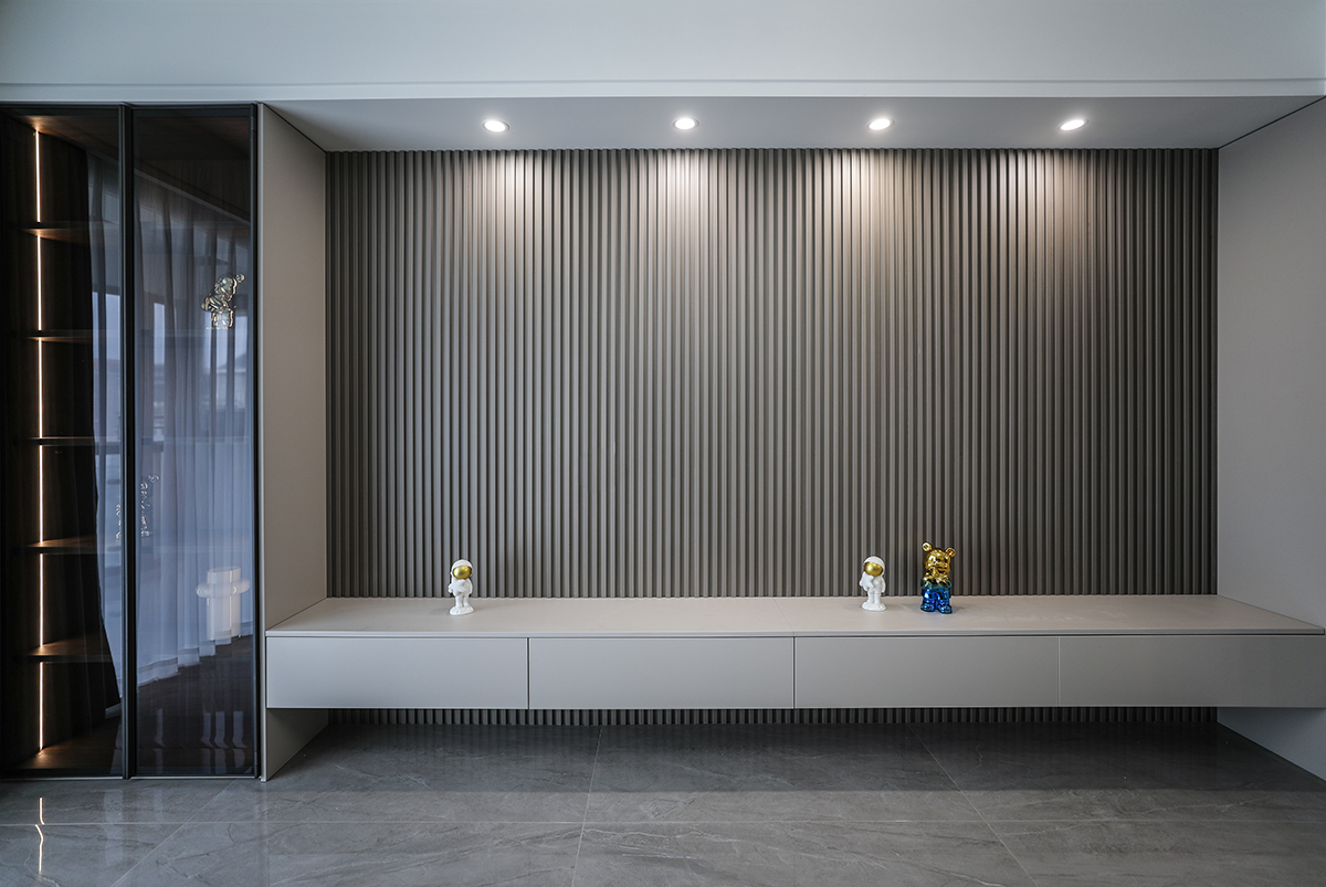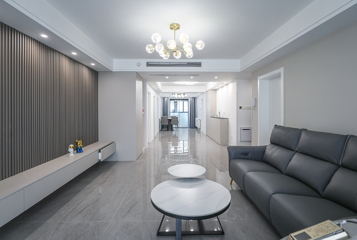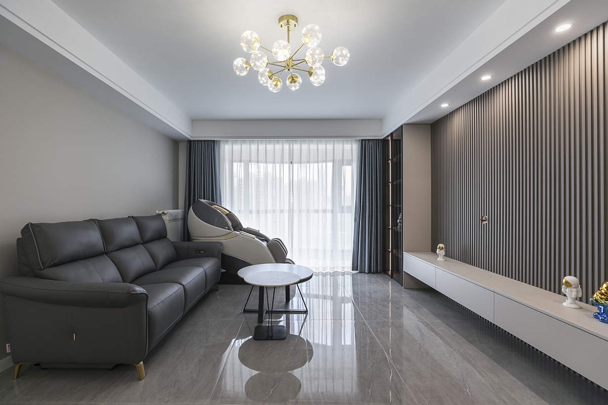 客廳是一家人活動(dòng)頻率最高的區(qū)域,要求寬闊、明亮?;疑鳛橹魃{(diào)不僅提升了整體空間質(zhì)感,更在延續(xù)簡(jiǎn)約風(fēng)格的中,使空間變得更加高級(jí)。