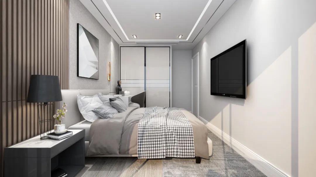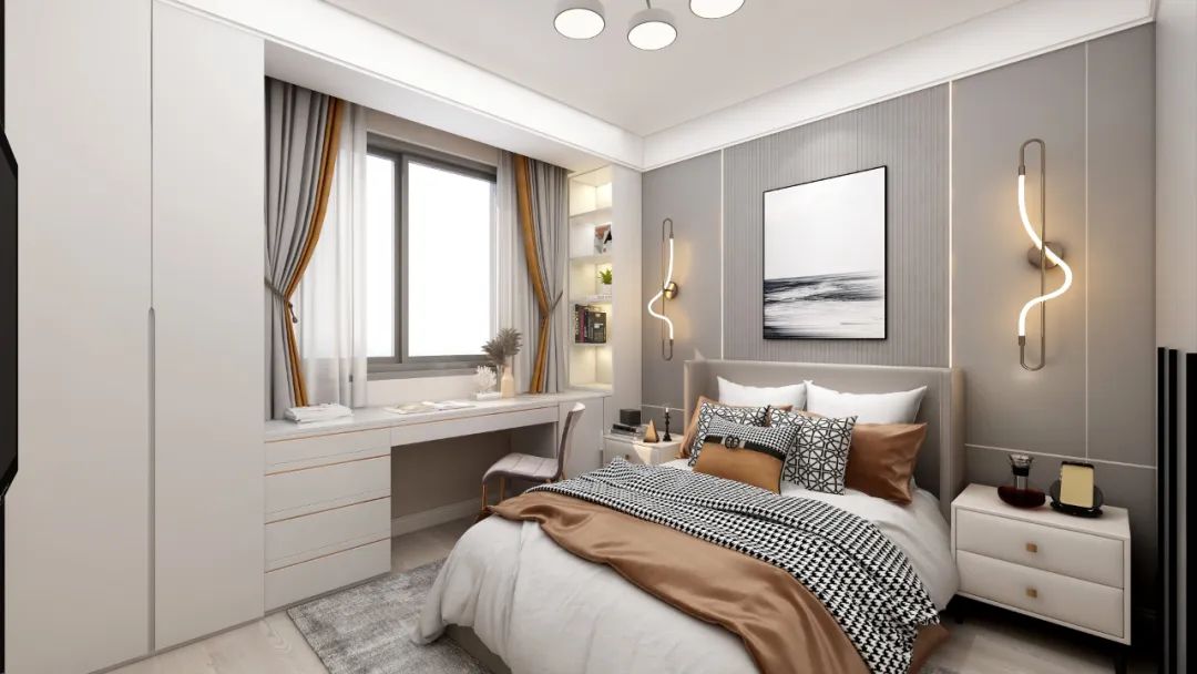 或者是把整個床頭背景墻都改成收納的款式,床頭嵌入柜子當(dāng)中,床頭柜也藏在柜子里,非常的實(shí)用。