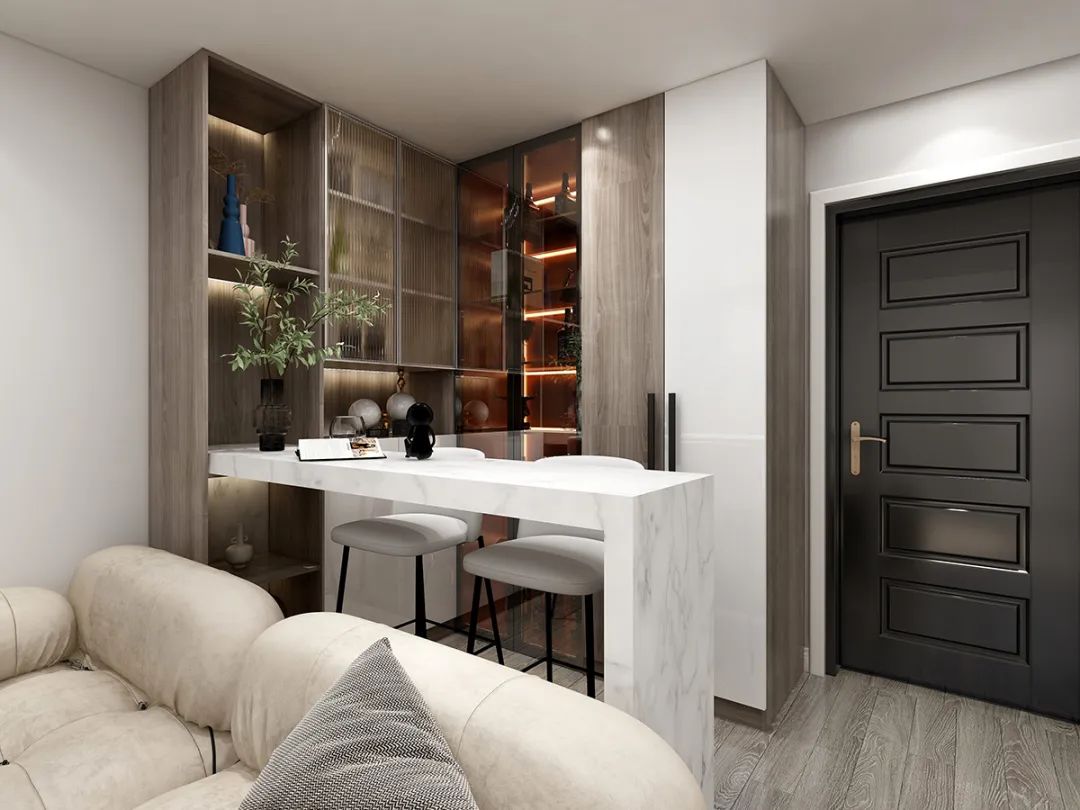 比如這個吧臺就設(shè)計(jì)在一進(jìn)門的位置,效果看起來也是蠻不錯的呢!
