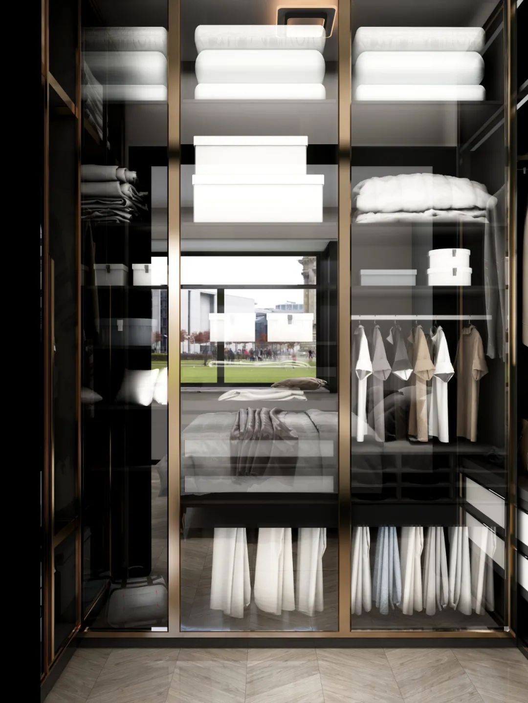臥室的床對(duì)面也可以設(shè)計(jì)成開放式衣帽間,搭配簡(jiǎn)潔的玻璃推拉門設(shè)計(jì),非常方便實(shí)用。