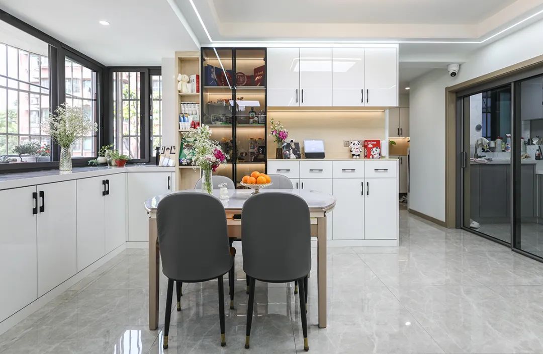 為了營造溫馨的就餐氛圍,吊燈和桌面之間的最理想的距離為70-80cm,在這樣的距離下,光束能均勻的照射到桌面,又不會覺得壓抑。餐邊柜的大小沒有特定的標準,可以按照空間的布局來設計,而深度則需要考慮到儲物所需容量,一般會做成40-60cm左右,常見的物品都能容納。