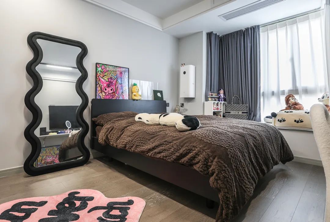 臥室的主體主要由衣柜、床、書桌組成,尺寸上根據空間安排即可,一般建議床側與墻保持50cm的距離,衣柜與床的距離不小于90cm,給柜門留出足夠空間。