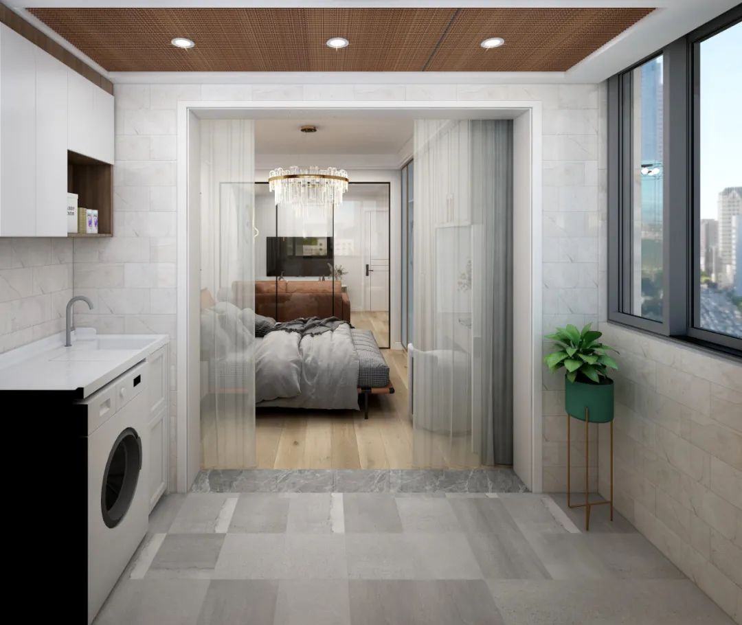 不僅是柜體,裝修時(shí)可以直接在陽臺(tái)安裝洗衣機(jī)柜,將洗衣機(jī)嵌入里面,這是生活陽臺(tái)的最佳設(shè)計(jì)范本。