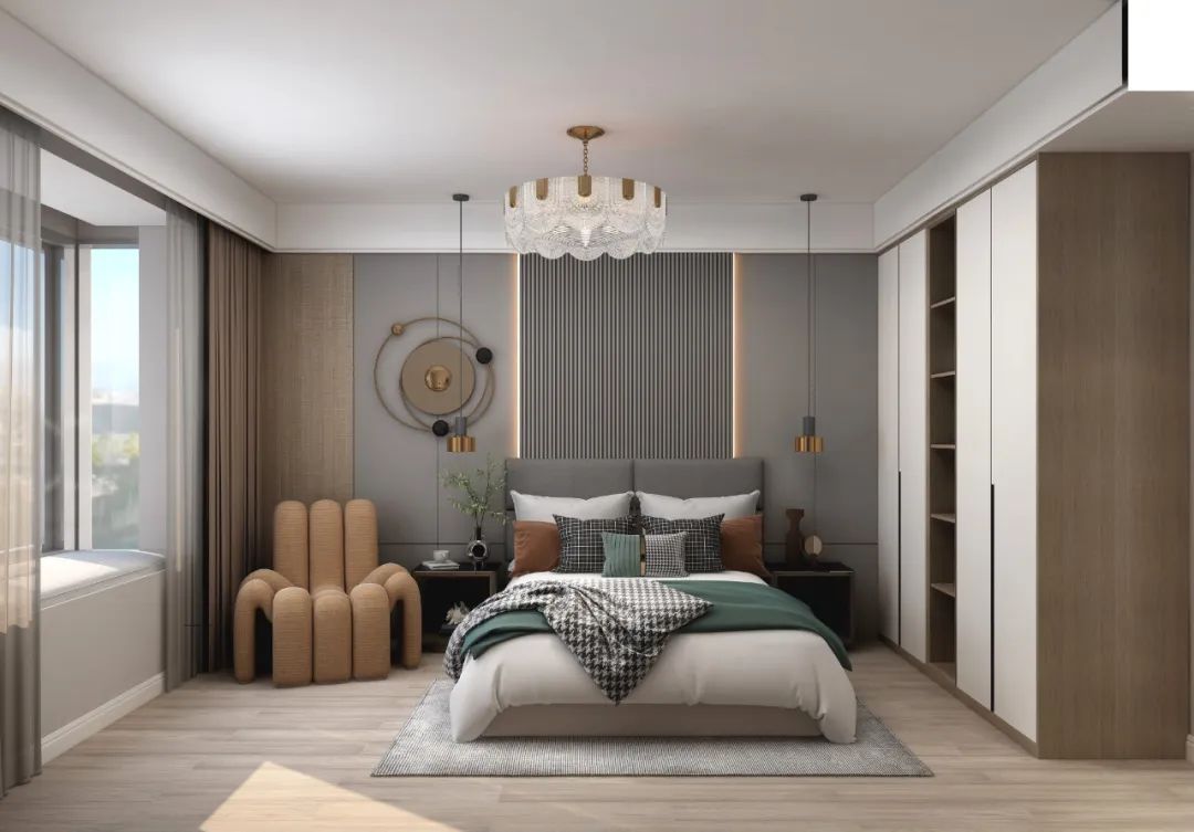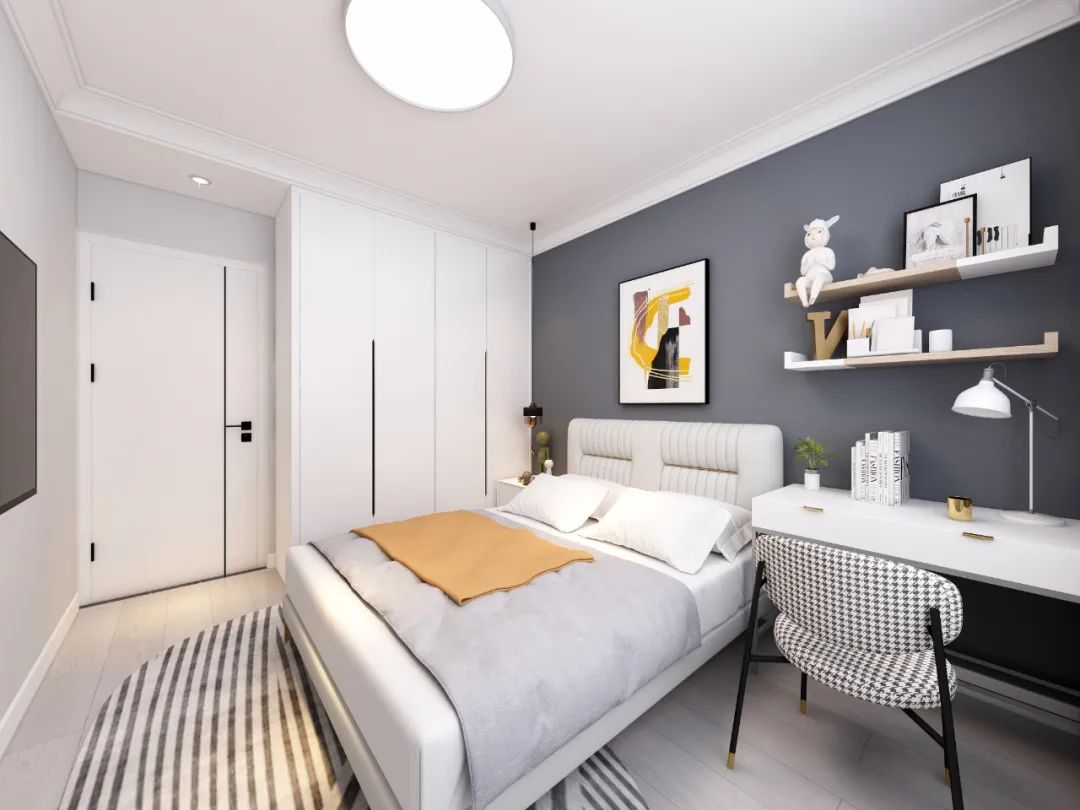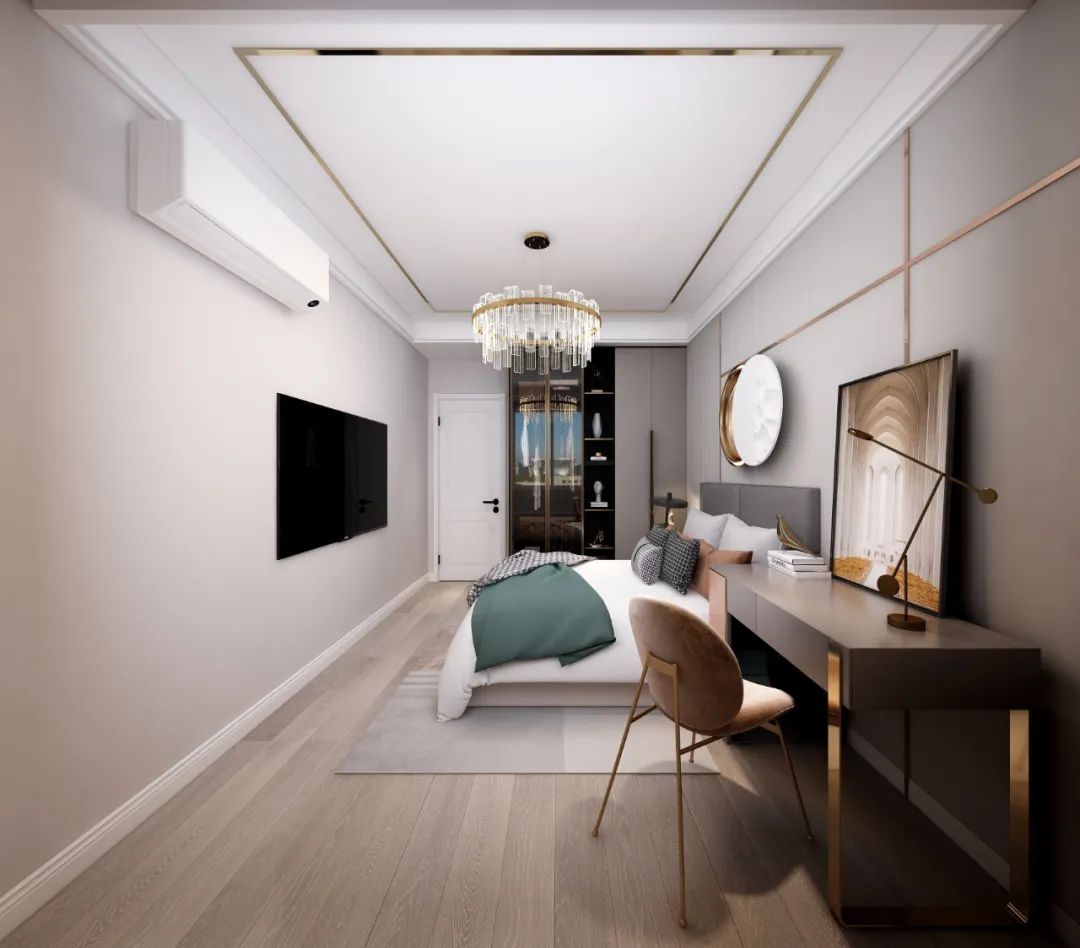 衣柜與梳妝臺的一體設計,不僅能有效利用空間,還能讓空間更具整體性。利用床尾的一整面墻定制衣柜+梳妝臺,選衣搭配和梳妝打扮之間的動線更短、更便捷。