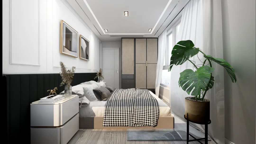 假如是小戶型臥室,床尾處通??臻g不大,沒有頂天立地衣柜,可將其安排在床頭柜位置。