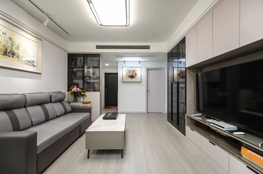 該房業主是一對夫妻,都是退休教授,對生活品質要求高,在造型上追求簡約穩重,色彩搭配上要求溫馨而不失高雅。基于業主的需求,該套居室搭配色采用暖灰木紋色搭配暖白色的基色,讓整個房子呈現出客戶想要的高貴大方,溫暖宜居的感覺。電視墻以大面積玻璃櫥柜,在提供客戶儲藏展示書籍、展品的同時,增加空間通透感。放置藍灰色皮質沙發,再用白色巖板茶幾搭配,體現現代風格的大氣時尚,簡潔、神秘和有質感,通過這裝飾布置打造出退休教授夫妻的頤養三居,塑造出簡中有序恰好處的氛圍感。