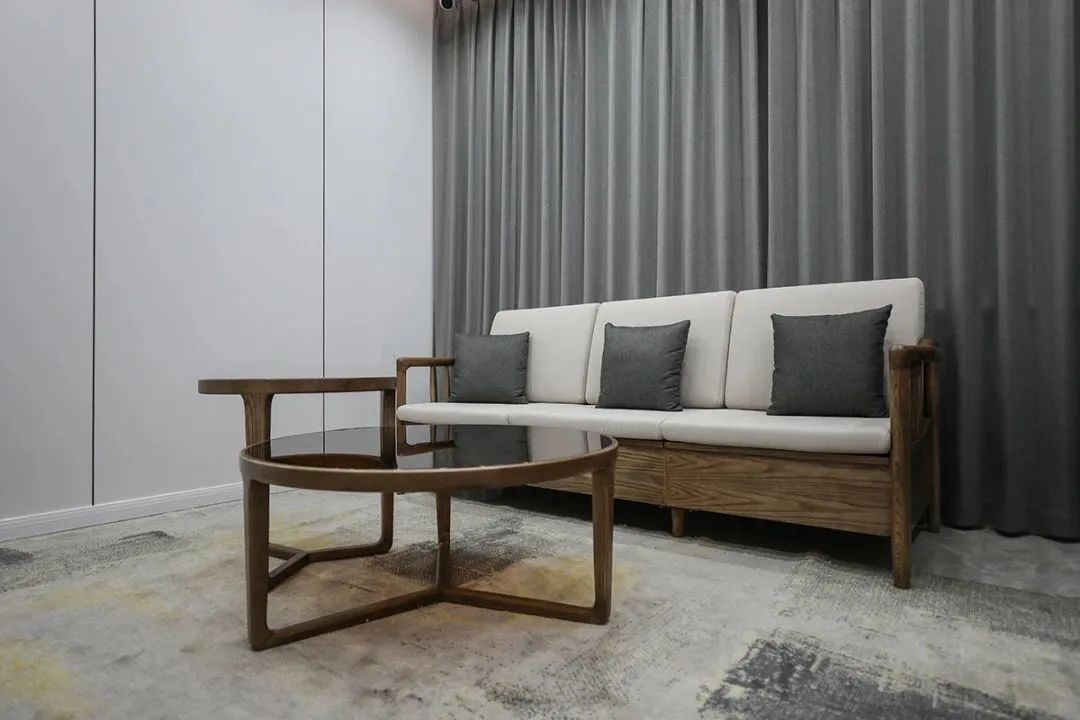 客廳沙發的背景是純色灰窗簾,簡潔的造型和精細的工藝,從進門那一刻便收獲一份豁然的心境。