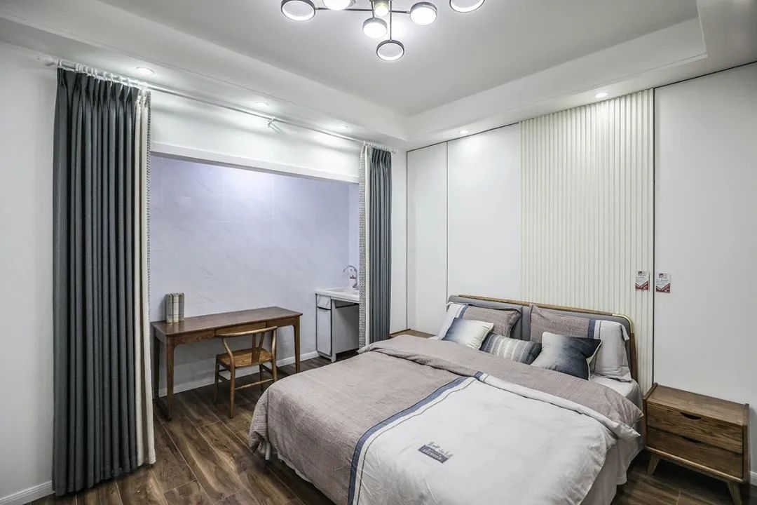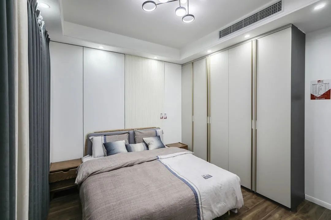 主臥簡約風格裝飾品比較簡單,床頭處米黃色護墻板,讓整個房間立體溫馨,窗簾的色調也正好。