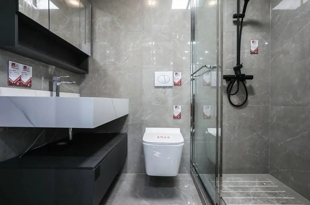 衛生間是最顯生活品質的地方之一,從瓷磚到洗漱臺,灰色、白色、黑色,非常安靜美好。