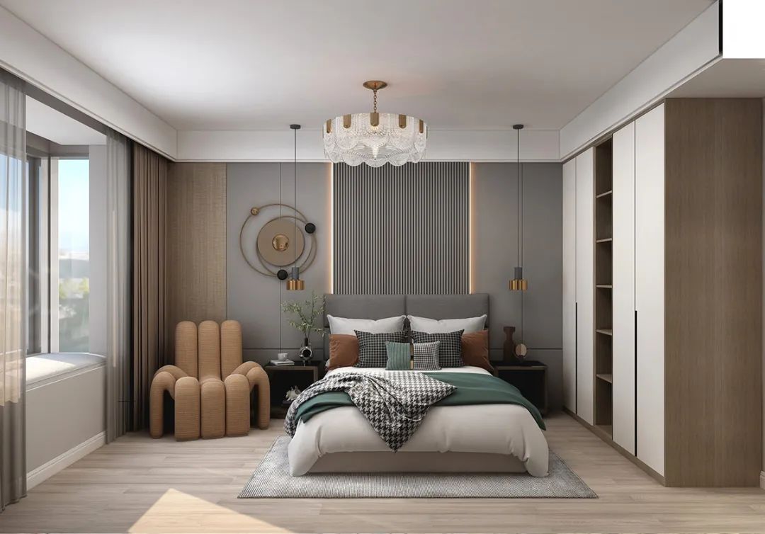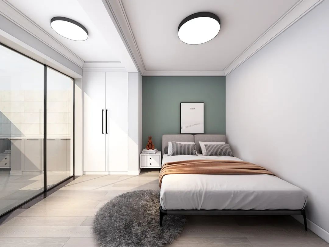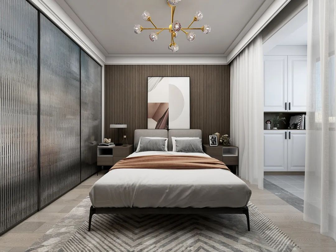 選擇家具是要先“簡”后“藏”,保證極少用到的物品,有足夠的收納空間,將之藏匿起來。而頻繁使用的東西,無需耗費時間尋找,始終放置在最顯眼之處。比如:床靠背換成背景硬包,只保留一個床箱。