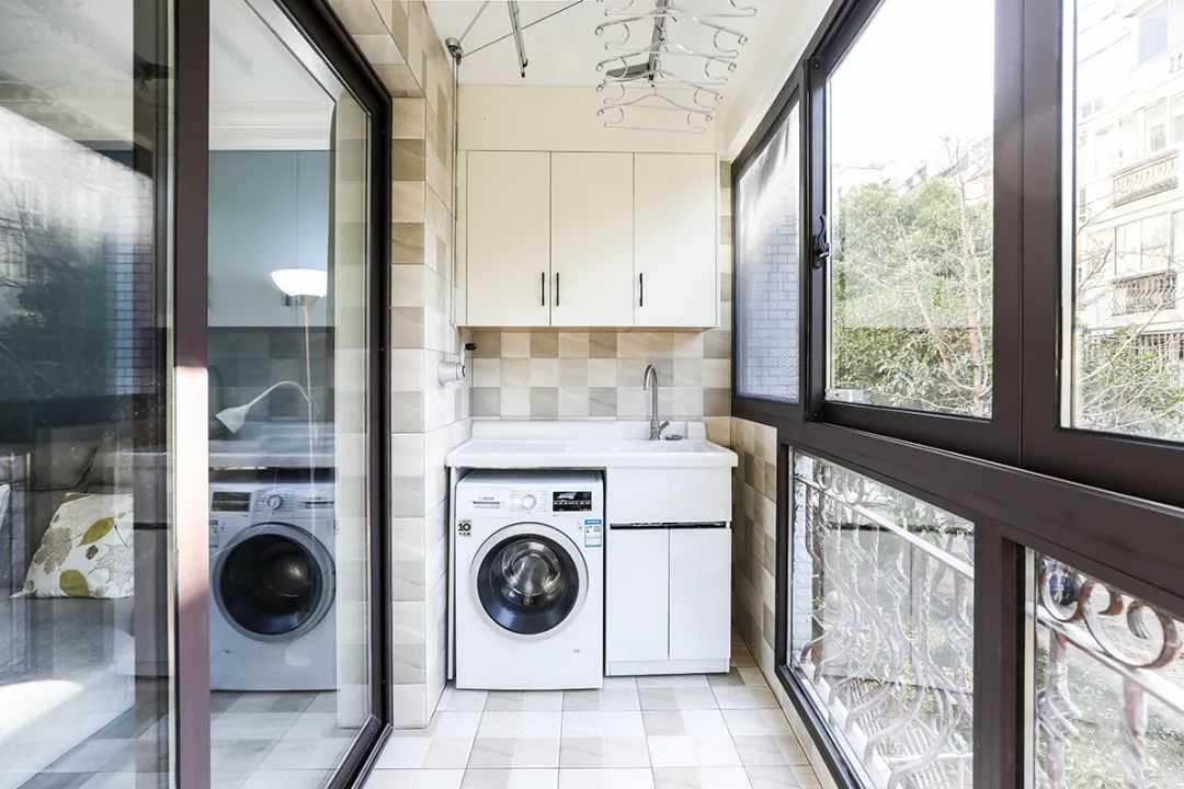 陽(yáng)臺(tái)墻地采用了灰白格墻地一體磚,好看不單調(diào)。