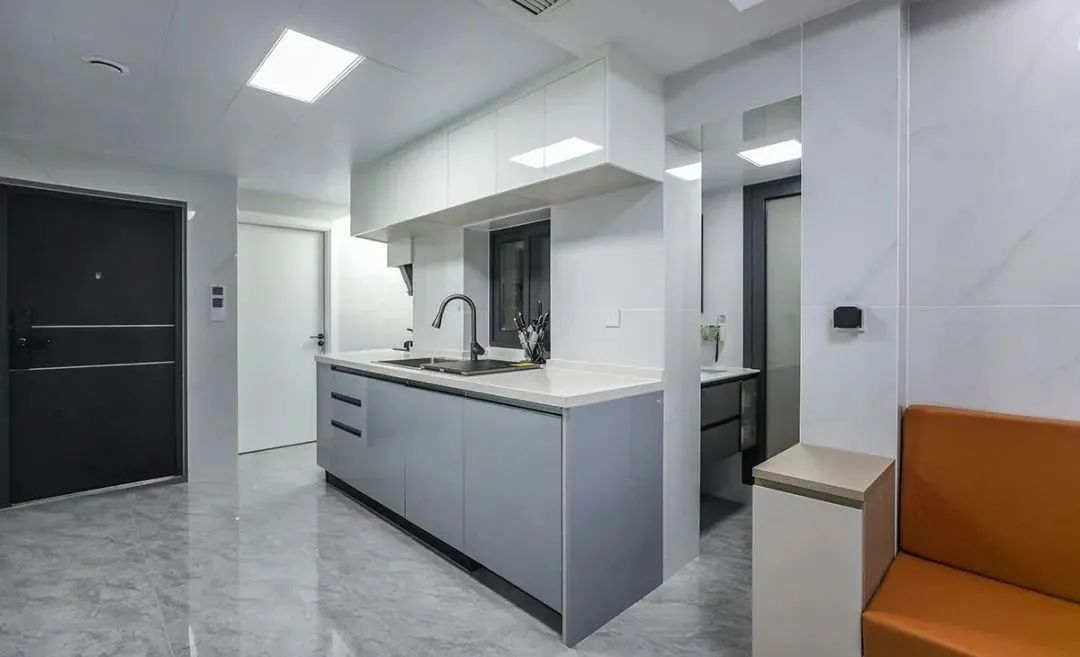 廚房采用上淺下深的設(shè)計(jì)理念,給人一種視覺景深的沖擊感,因?yàn)榭蛻艏依镄∨笥严矚g藍(lán)色,所以櫥柜底部采用淺青藍(lán)柜身,這也算滿足小朋友的一個(gè)小小心愿。