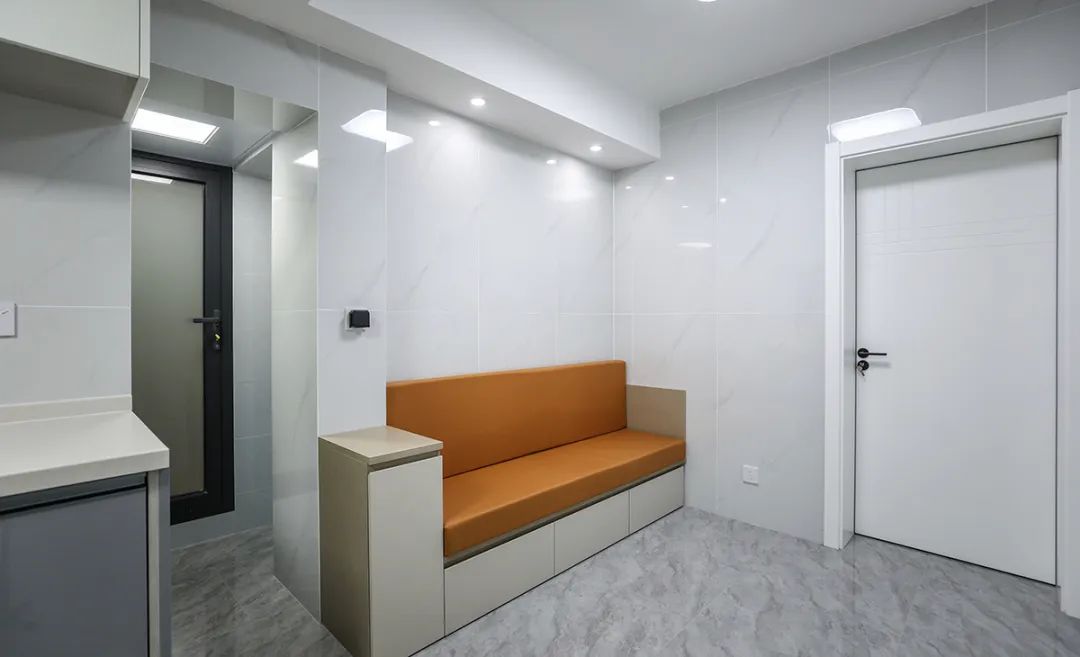 餐廳的餐桌采用靠近墻邊放置,不影響走道空間,墻壁掛簡約裝飾物進(jìn)行點(diǎn)綴,頂面鋁扣板吊頂便于清潔,也使得空間整體風(fēng)格保持一致。
