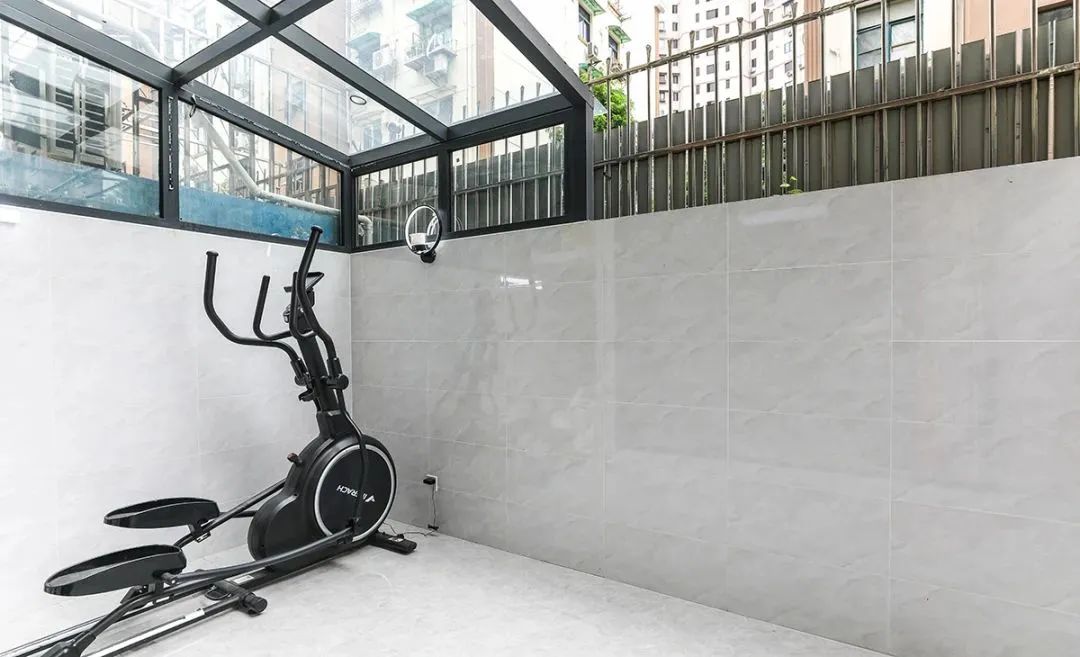 陽臺(tái)墻地采用了灰白格墻地一體磚,好看不單調(diào)。天井作為一個(gè)靈活變動(dòng)的空間,也可以作為運(yùn)動(dòng)區(qū)域,也可用作茶室。親朋好友來訪,席坐于此,可以在忙碌的生活之余放松身心。