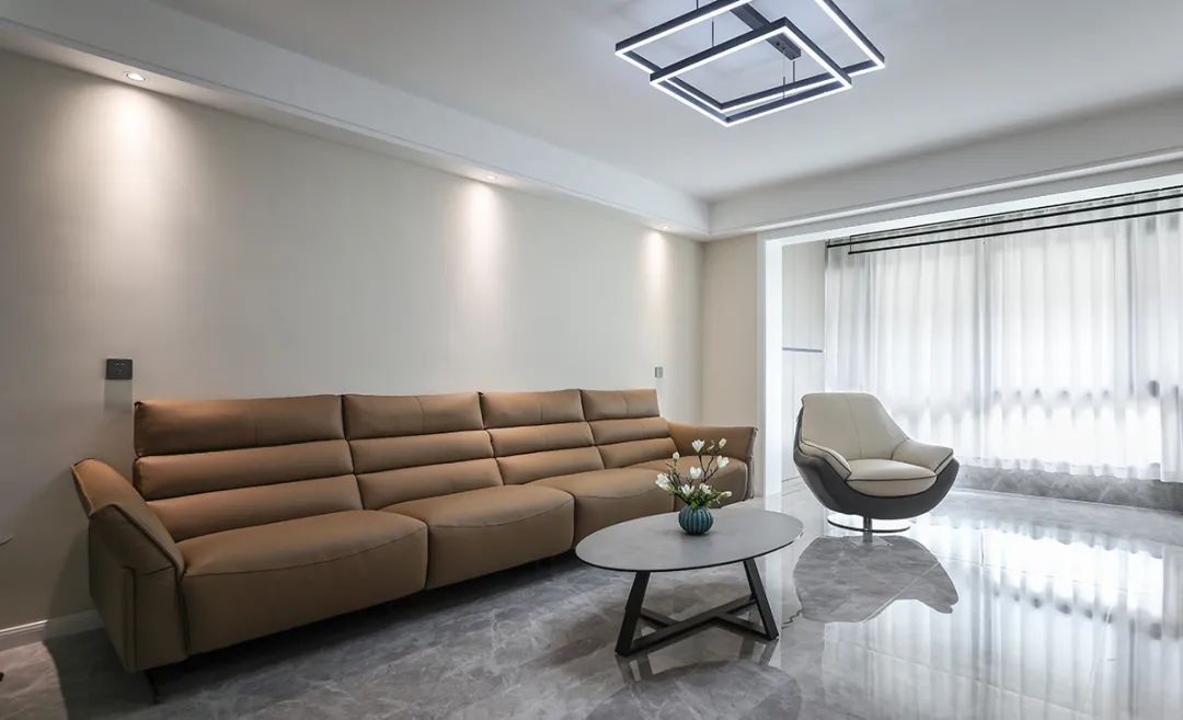 3米多的長沙發,咖色加上原本暖灰的瓷磚,奶咖色的電視柜,顏色統一有層次。