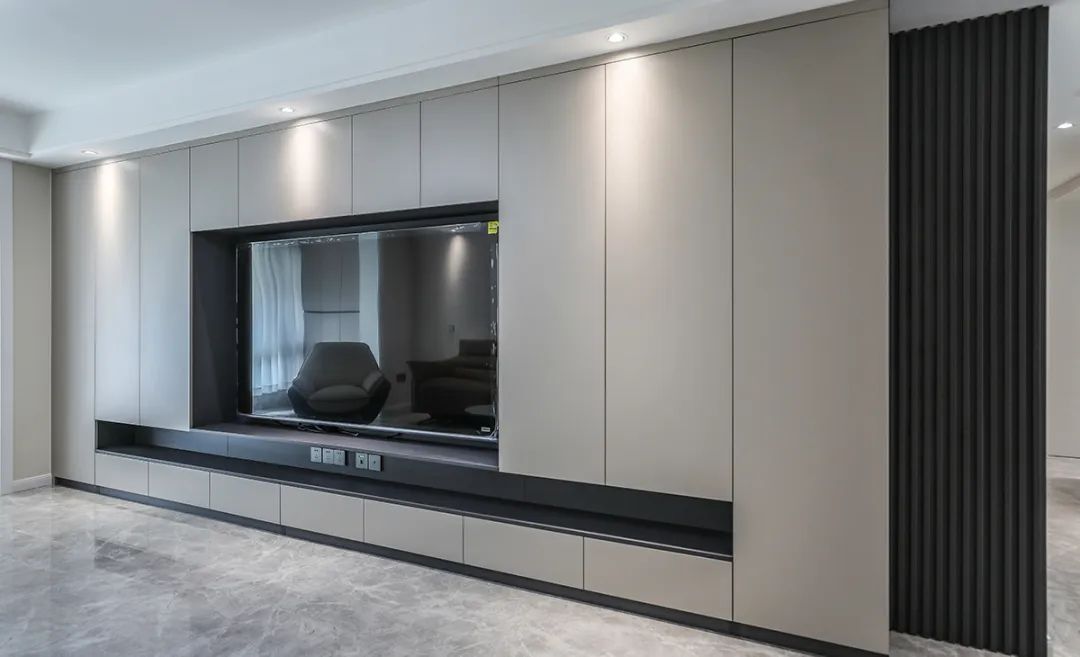 一整面電視柜做到底會覺得很笨重,先以格柵點綴,加長電視柜,讓原本有點偏移的電視背景做到了完全對稱,后期角落可以放上綠植,層次感又一次加滿。