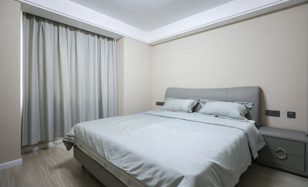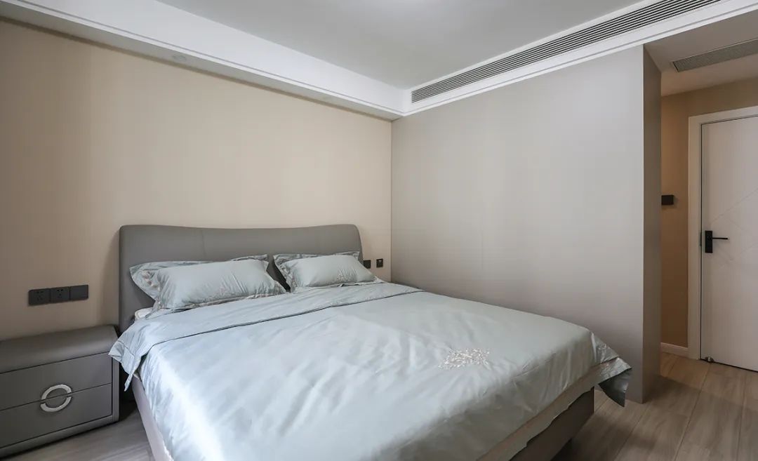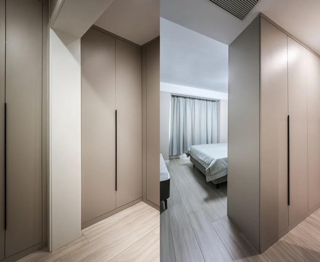 臥室做了轉角衣柜流出來的過道直角通向衣帽間,私密度更好儲物翻了一倍,色調還是以大氣的奶咖色,時尚耐看。