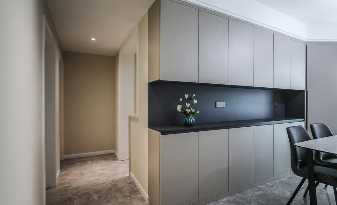 進門的多功能儲物柜絕對是房子的點睛之筆,沒有單單的做了鞋柜或者衣帽間,這樣做會顯得空間更開闊,而且儲物布局更分配合理。