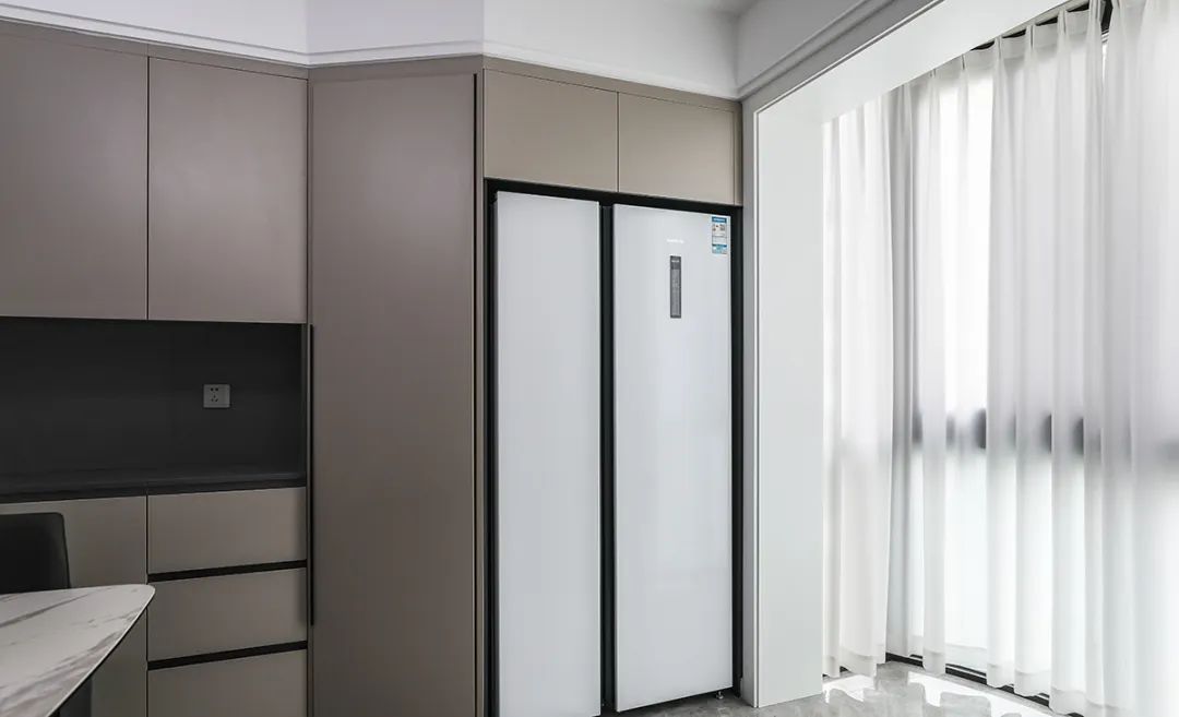 餐廳的餐邊柜加上雙門大冰箱一體合成,灰色柜體板和瓷磚呼應,奶咖色柜門板讓整個家庭溫馨起來,超薄巖板餐桌簡約大氣。