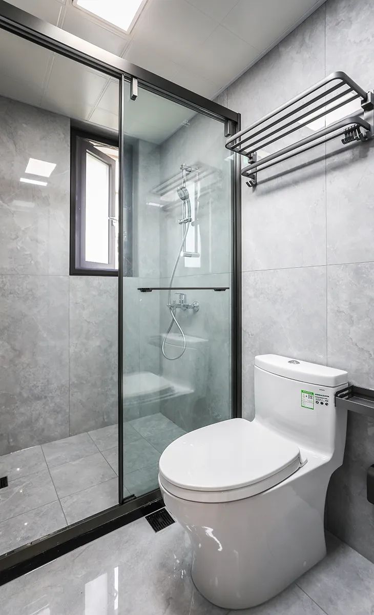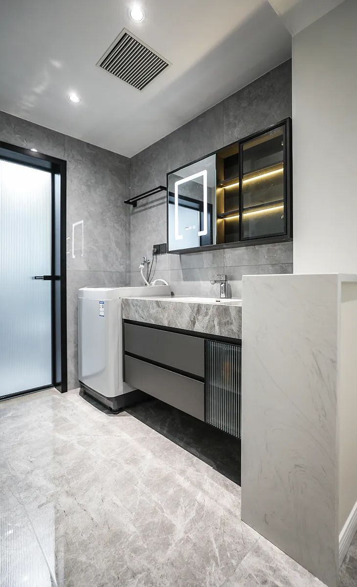 暖灰的色調,干區1米的臺盆柜邊上還可以放一個備用洗衣機,衛生間長虹超白窄邊開門,極簡的線條,600*1200的墻磚顯得衛生間更加大氣。