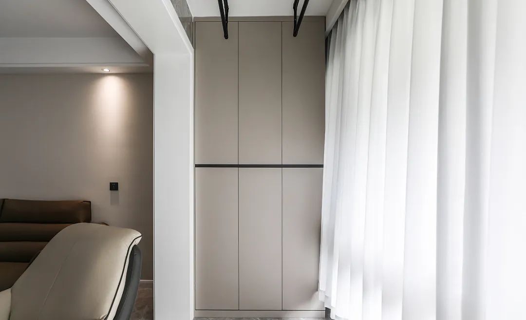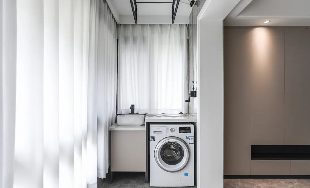 陽臺落地玻璃,洗衣柜的一面砌了矮墻,方便排水管,整體更美觀。陽臺的承重墻兩邊對應著一面儲物柜,一面洗衣機臺盆組合柜,簡約大氣,功能合理分配。