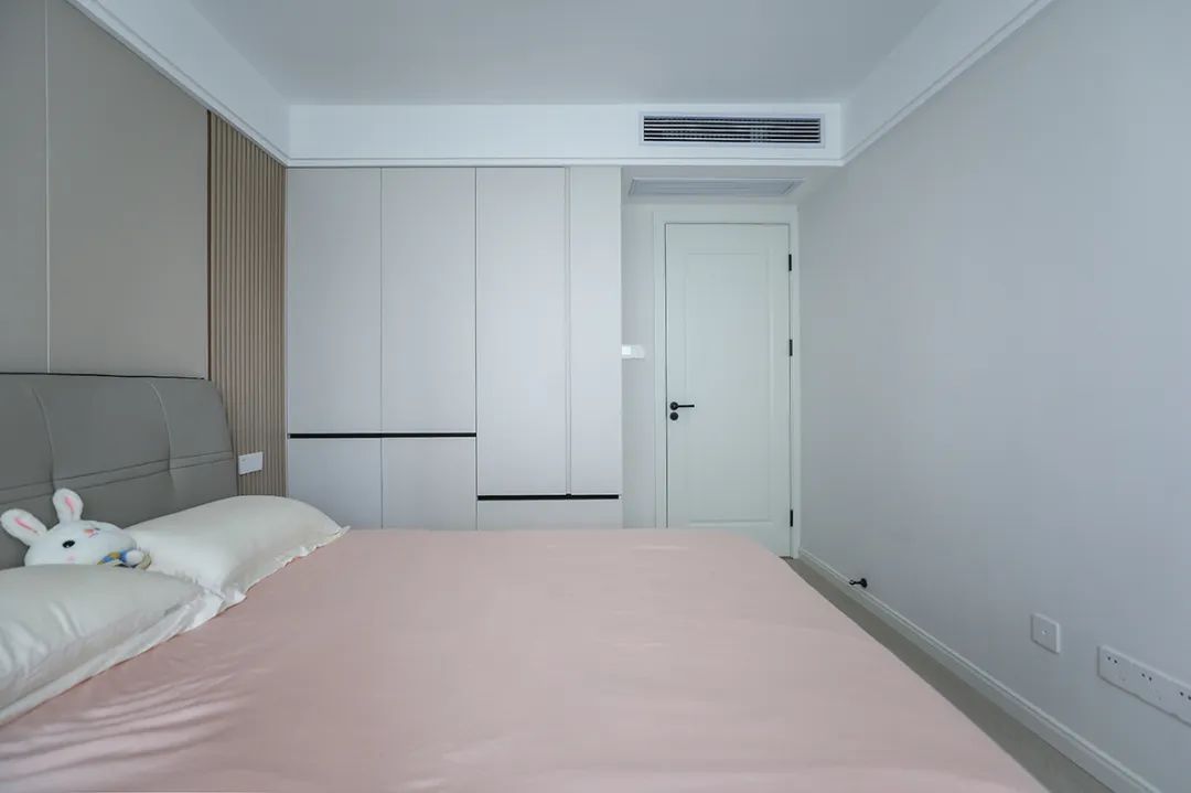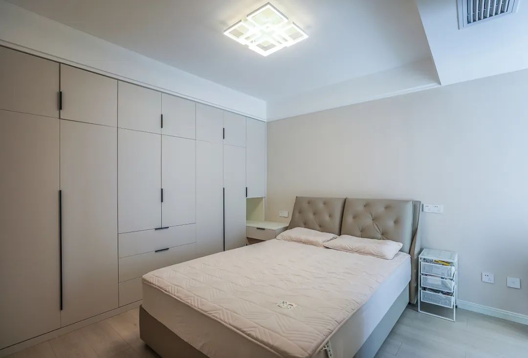 主臥床頭背景和客廳沙發背景采用了一樣的材質來裝飾,做到了統一風格以及色系。地板選用淺色系的灰木紋地板,再配上同色系的床來搭配,讓整個空間顯得干凈簡潔。