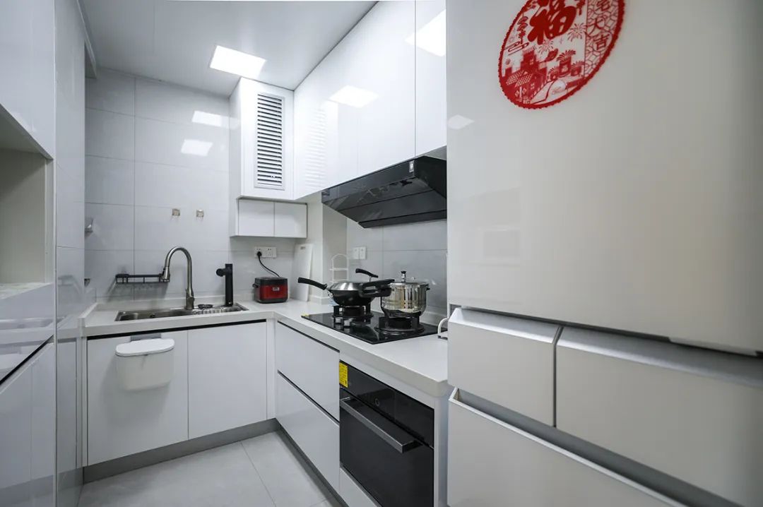 該套房子廚房空間很大,L型兩面櫥柜,另外冰箱邊上也有操作臺,顏色簡潔明快,材質干凈、好打理,白色的吊頂和白色的櫥柜相呼應,石英石臺面經久耐用,各種廚房電器全部配齊,滿足主人制作各種美食。