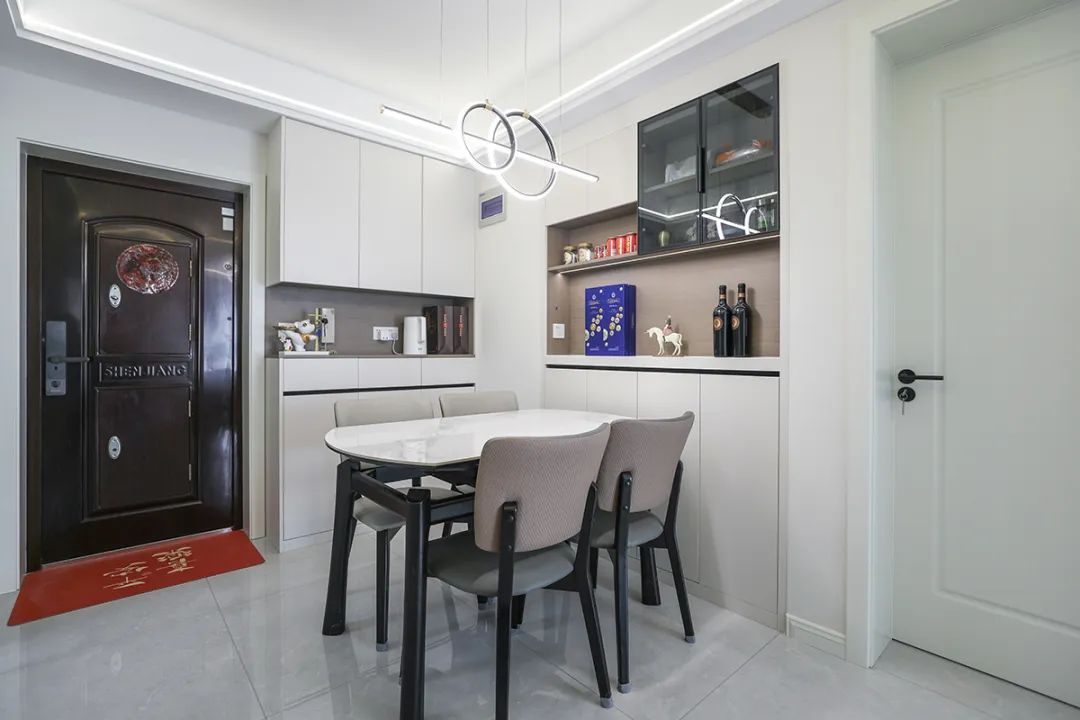 餐廳空間與門廳空間連成一體式,而餐桌邊的裝飾柜是利用原墻體厚做的,增加了餐廳儲物以及裝飾空間。
