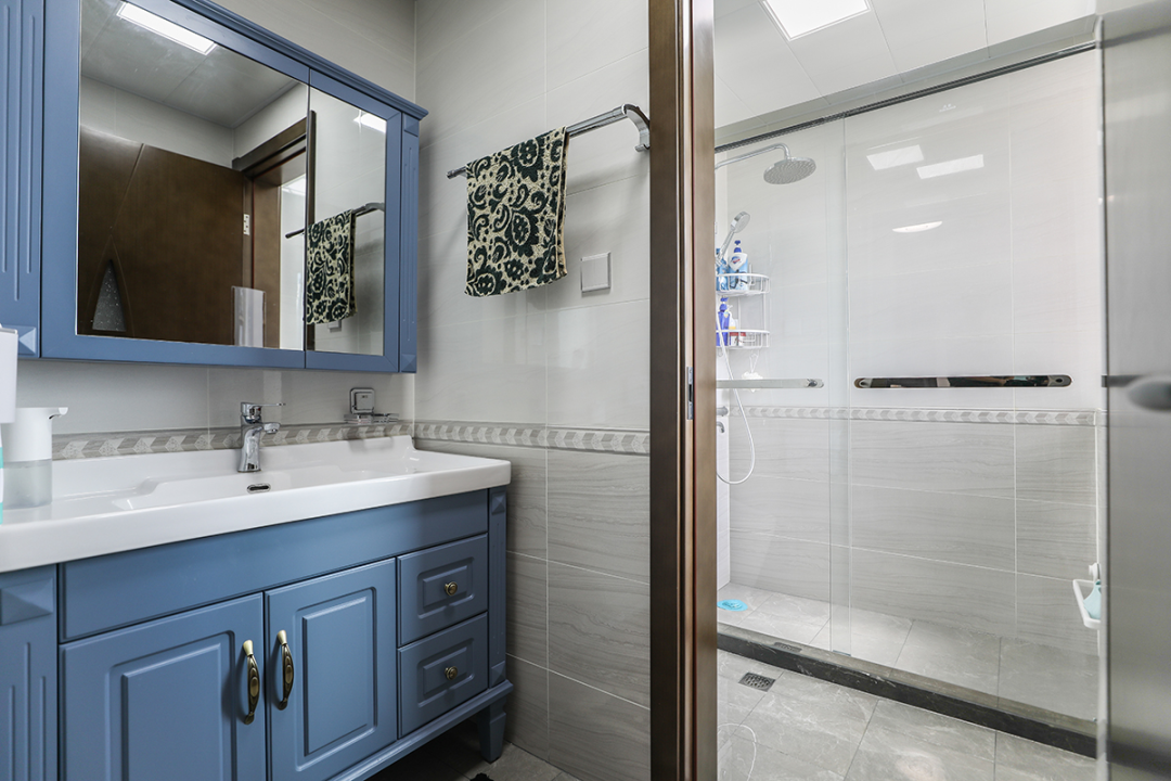 設計說明:這款設計融合了現代和傳統元素,展現出獨特的風格。定制柜均使用了湛藍色的實木材質,呈現出一種異域的質感。同時,白色的衛浴設備和家具又賦予了空間現代感。整體設計既具有傳統之美,又不失現代氣息。