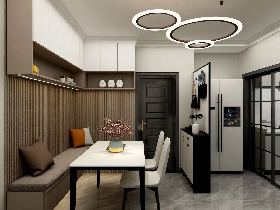 設計說明:本案例隔斷采用了黑白配色方案,黑色的底柜四邊和白色的柜門、屏面形成了強烈的對比。而且與廚房推拉門相呼應,使整個空間視覺更加統一。