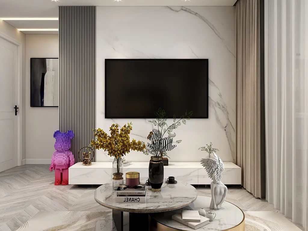 設計說明:此電視墻采用極簡的設計,沒有任何多余的裝飾,以平滑的線條和完美的幾何形狀為特點。選用的材質也是高質感和高性能的材料,大理石和高級灰的柵格板。整個設計注重簡潔、舒適和現代感。