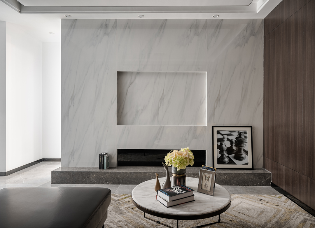 設計說明:這款案例采用大塊大理石板拼合而成,預留的電視墻也是可丁可卯,這款電視墻既滿足了客戶對于空間整體性的要求,又讓家居整體顯得貴氣十足,另外電視墻下的長條形凹槽設計非常巧妙,可以方便線纜收納,放置音響設備。