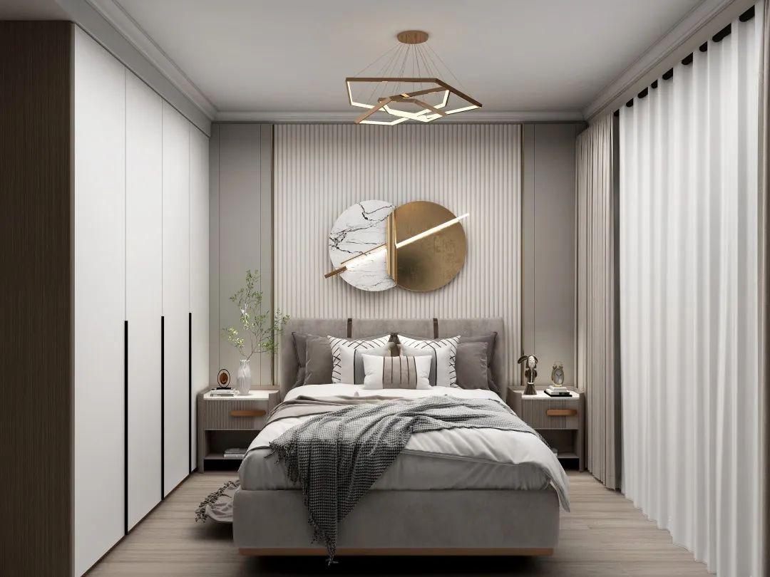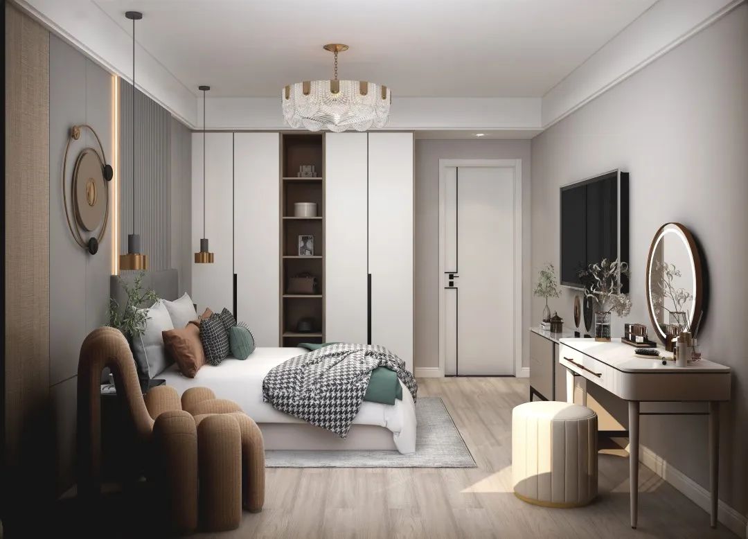 設計說明:這款定制柜與臥室背景對立又統一。開放式與封閉式儲物空間相結合,滿足不同物品的存放需求。同時,在細節處理上加入了無把拉手和邊框線條,為整個空間增添了一些復古韻味。