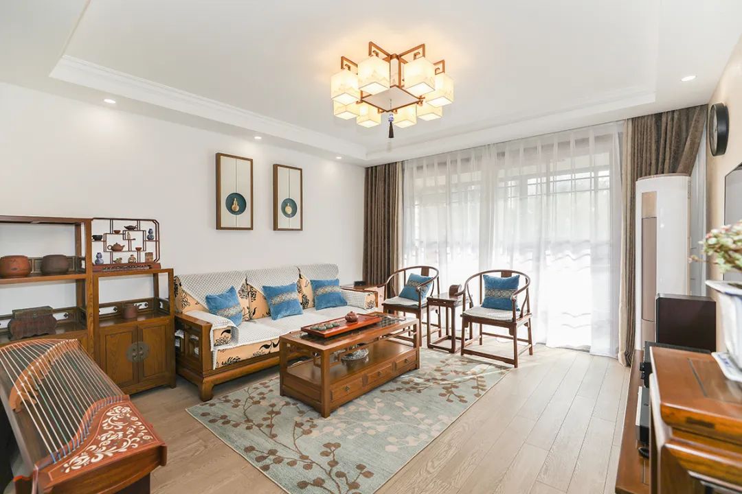 本案例將實木家具作為主要元素。實木家具有天然、環保、耐用等優點,且風格多樣,可以滿足不同人群的需求。實木沙發、實木茶幾、實木電視柜等家具。這些家具的設計簡潔大方,線條流暢,充滿東方韻味。