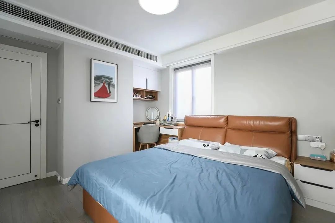 秉持“主臥居住”原則,在此空間內我們并沒有過多贅述,而是合理地利用了空間、統一了整體風格。考慮到色彩對睡眠的影響,墻面乳膠漆采用了顏色稍淺的暖灰,提升明亮、溫暖感。