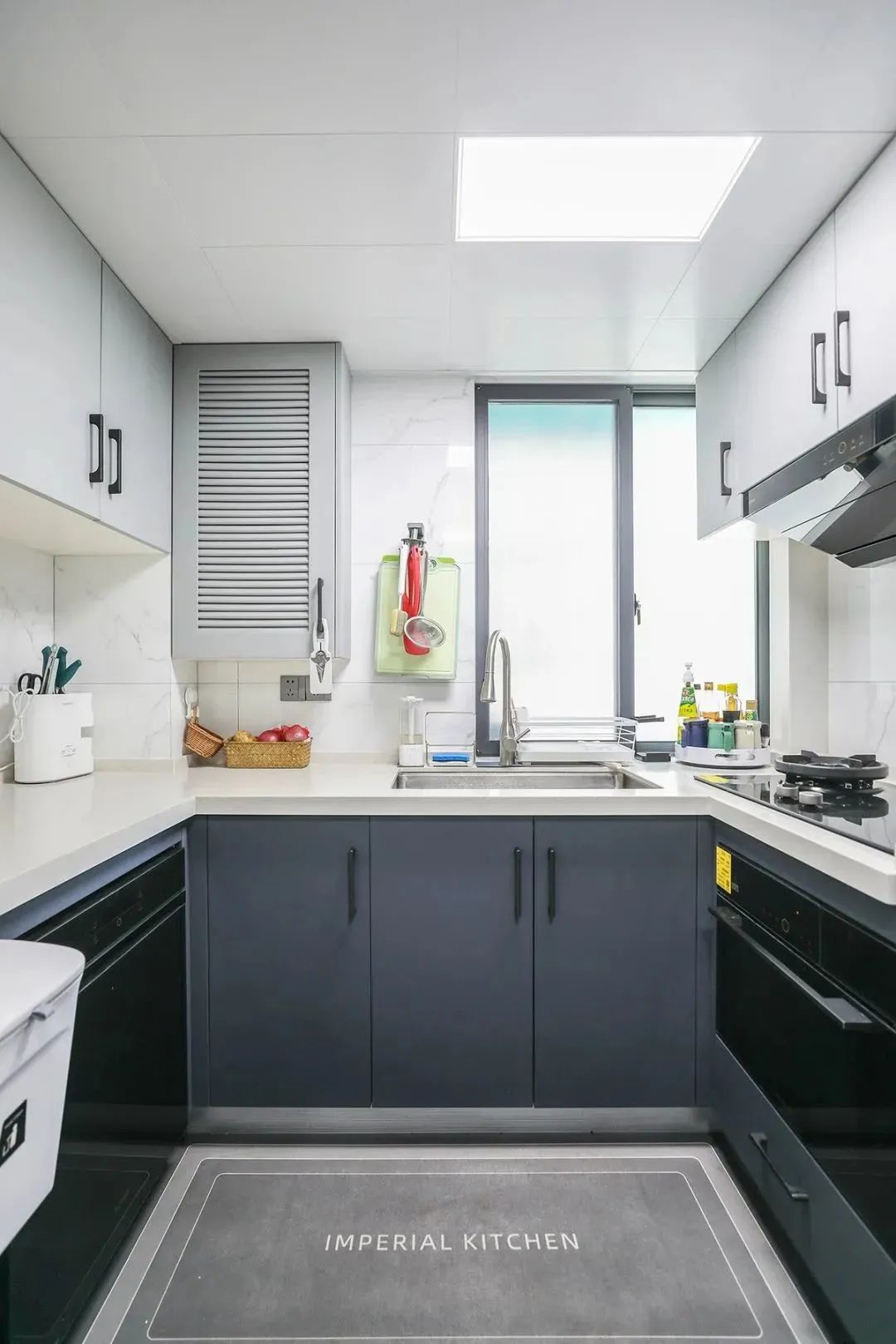 廚房設計采用了U型操作臺,使廚房操作擁有最佳動線。顏色搭配上白下灰,石英石臺面與上柜顏色遙相呼應,上端的淺色系與下柜的灰色系又形成碰撞,讓整個空間輕快許多。