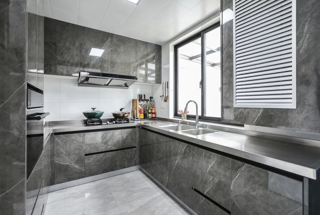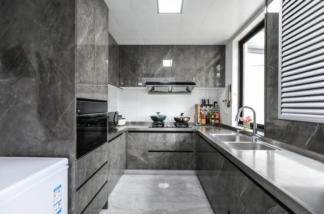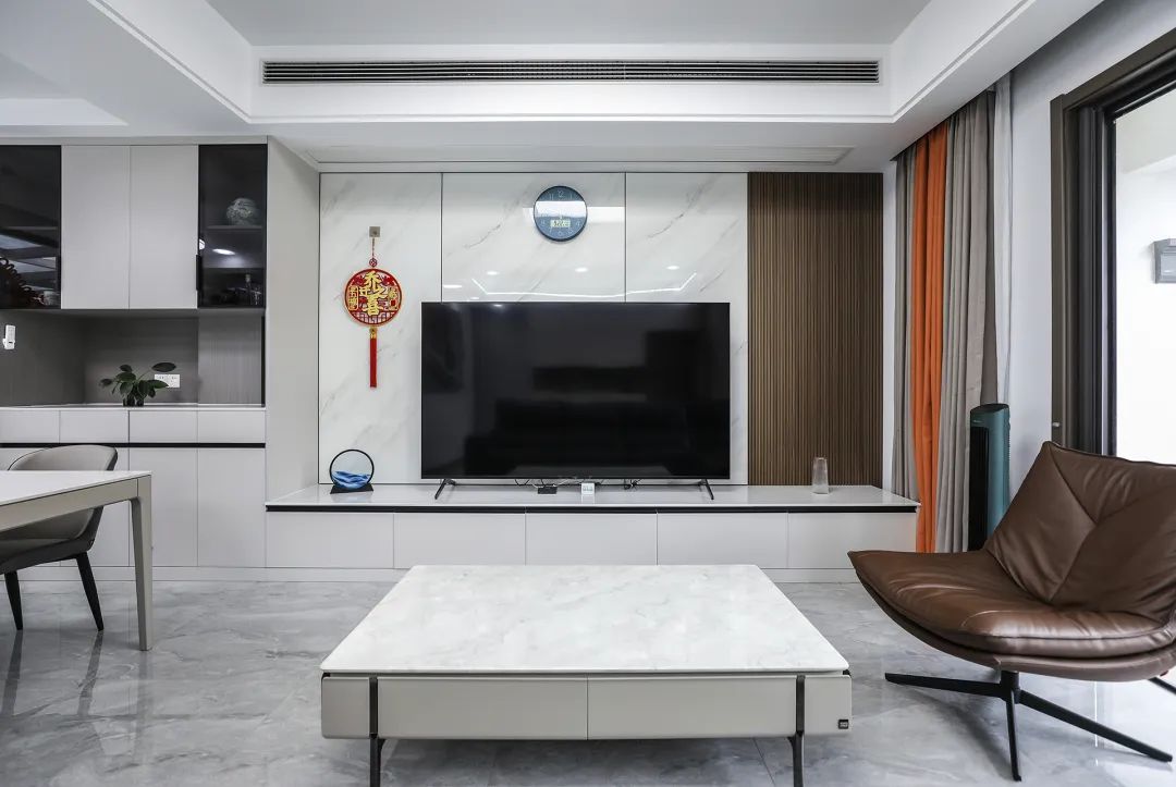 電視背景與餐邊柜融為一體,縱向的延伸增大客廳的比例感。巖板電視背景也很大氣,讓空間不但時(shí)尚而且清爽。