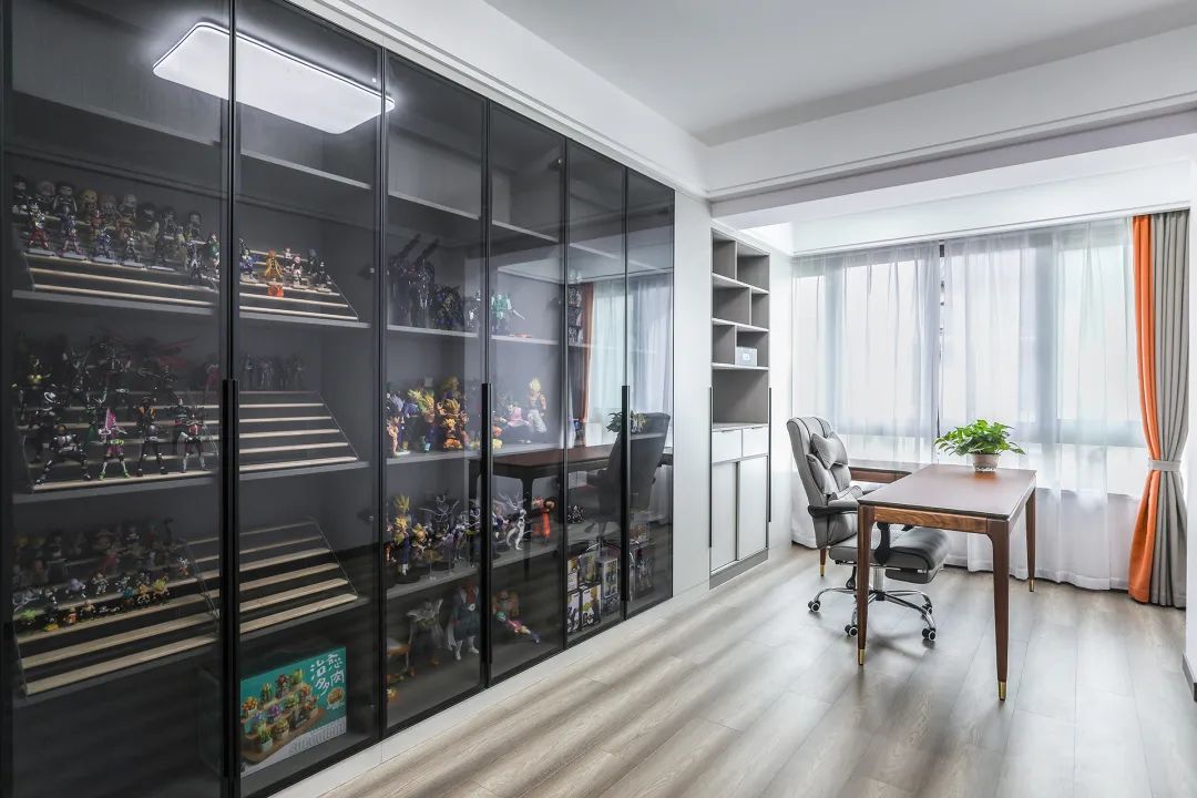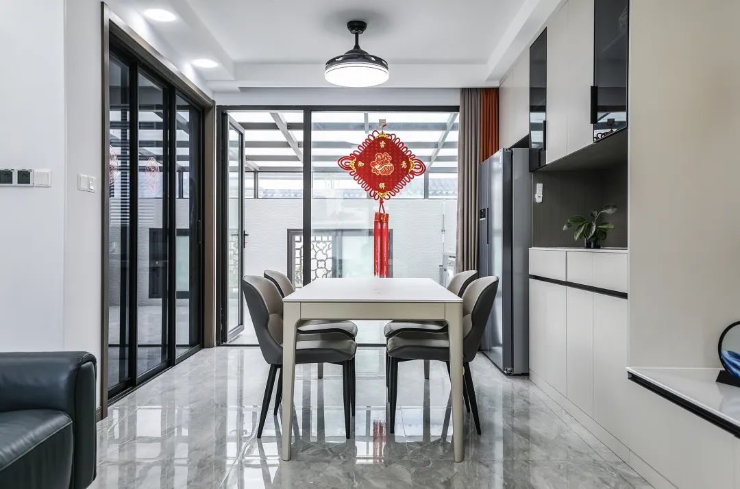 餐廳空間比較方正寬敞,又有一個(gè)大落地窗,靠墻做一排裝飾柜,既實(shí)用、又有裝飾功能,膚感灰+木色框架,極窄邊框玻璃門(mén)板相呼應(yīng),巖板餐桌把用餐氛圍調(diào)和的很溫暖,淺灰色地磚很干凈,色彩和造型上都簡(jiǎn)潔大氣。